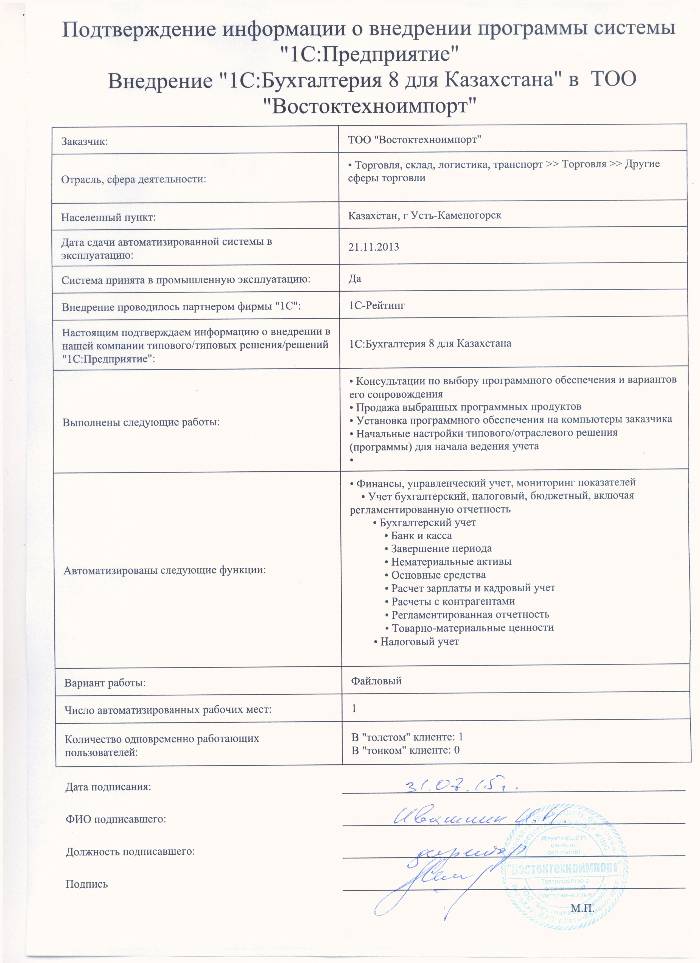 | Внедренное типовое решение: | 1С:Бухгалтерия 8 для Казахстана |