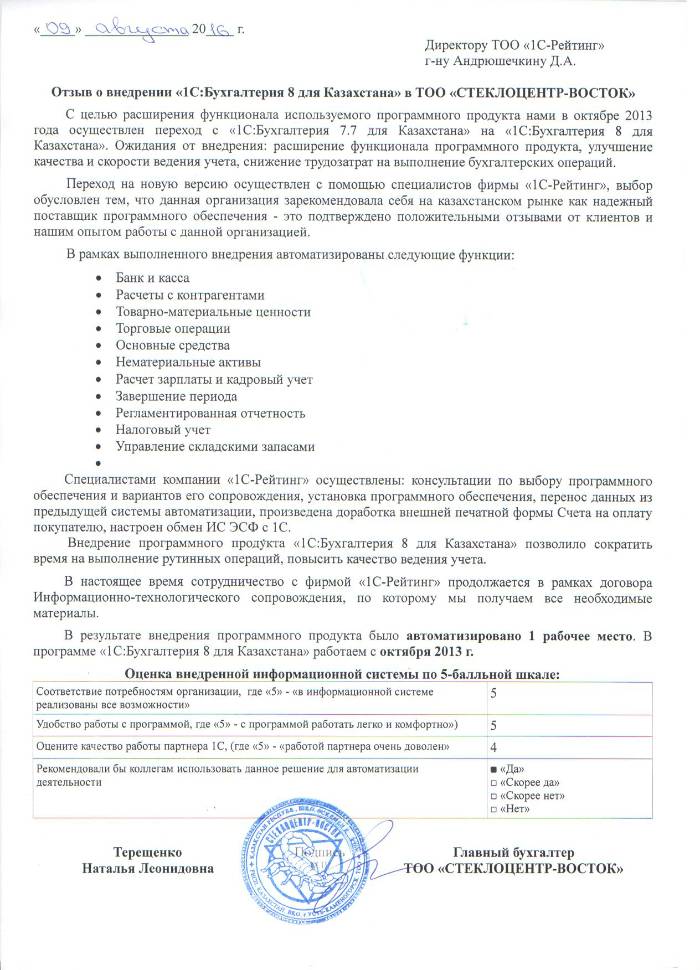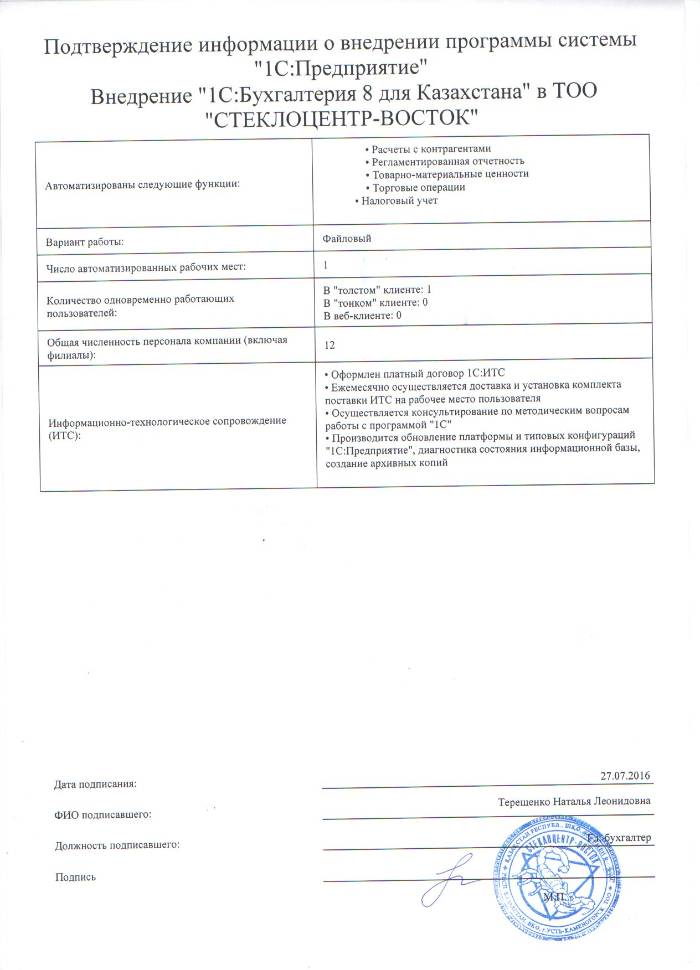 | Внедренное типовое решение: | 1С:Бухгалтерия 8 для Казахстана |