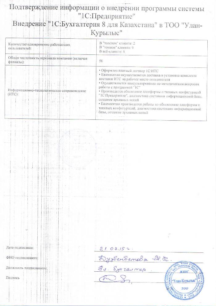 | Внедренное типовое решение: | 1С:Бухгалтерия 8 для Казахстана |