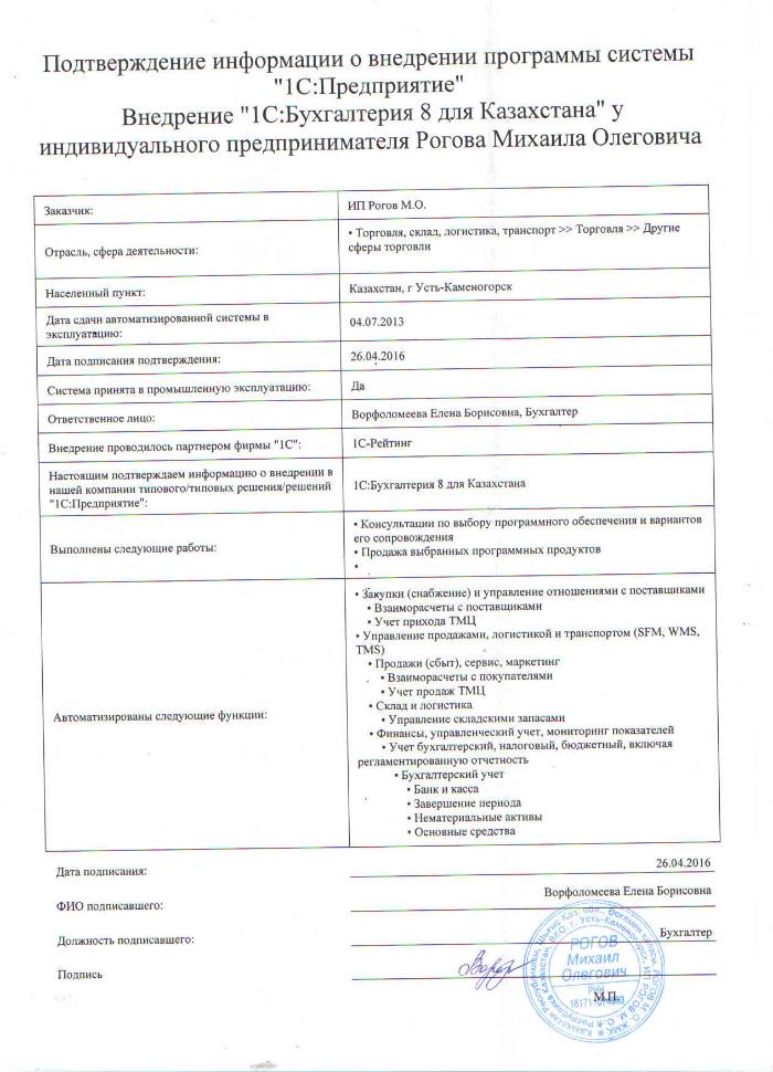| Внедренное типовое решение: | 1С:Бухгалтерия 8 для Казахстана |