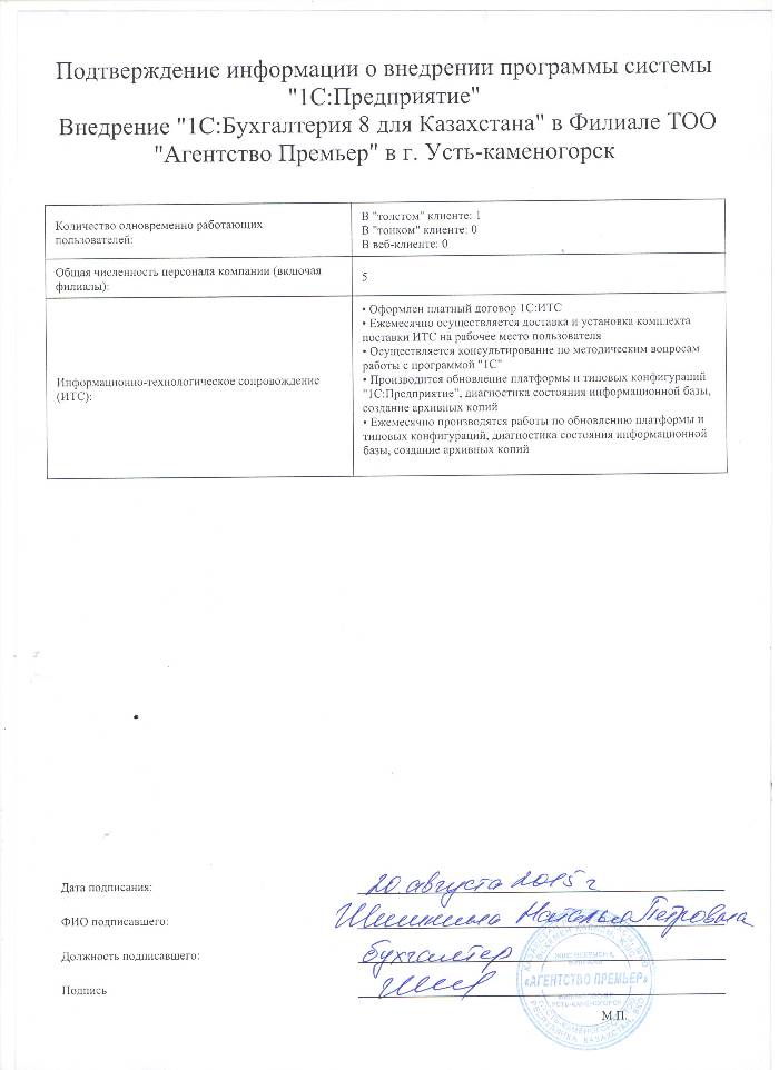 | Внедренное типовое решение: | 1С:Бухгалтерия 8 для Казахстана |