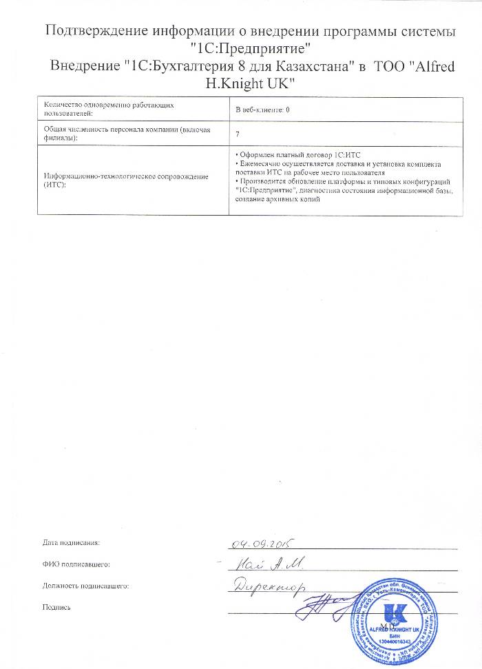 | Внедренное типовое решение: | 1С:Бухгалтерия 8 для Казахстана |