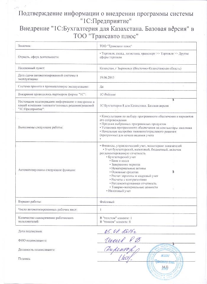 | Внедренное типовое решение: | 1С:Бухгалтерия 8 для Казахстана. Базовая версия |