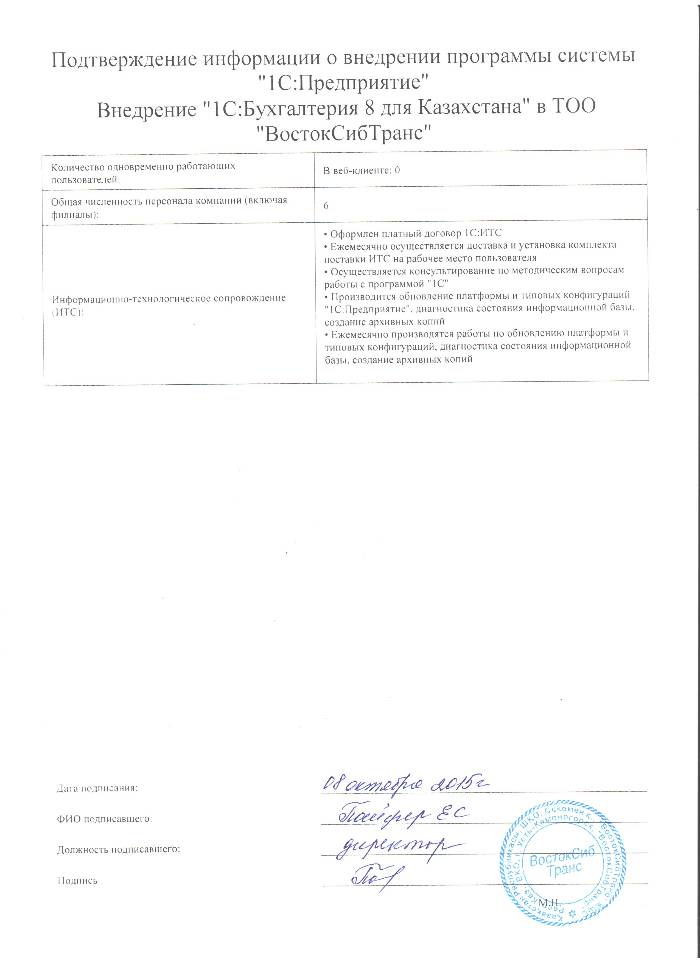 | Внедренное типовое решение: | 1С:Бухгалтерия 8 для Казахстана |