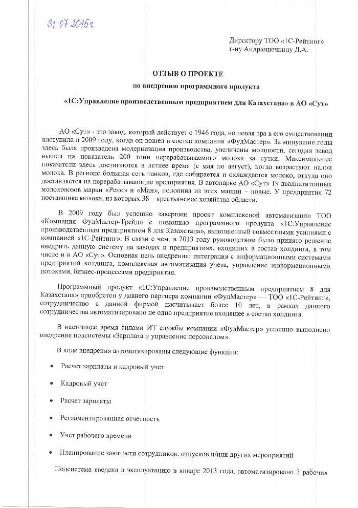 В 2009 году был успешно завершен проект комплексной автоматизации ТОО «Компания ФудМастер-Трейд» с помощью программного продукта «1С:Управление производственным предприятием 8 для Казахстана», выполненный совместными усилиями с компанией «1С-Рейтинг». В связи с чем, в 2013 году руководством было принято решение внедрить данную систему на заводах и предприятиях, входящих в состав холдинга, в том числе и в АО «Сут». Основная цель внедрения: интеграция с информационными системами предприятий холдинга, комплексная автоматизация учета, управление информационными потоками, бизнес-процессами предприятия.