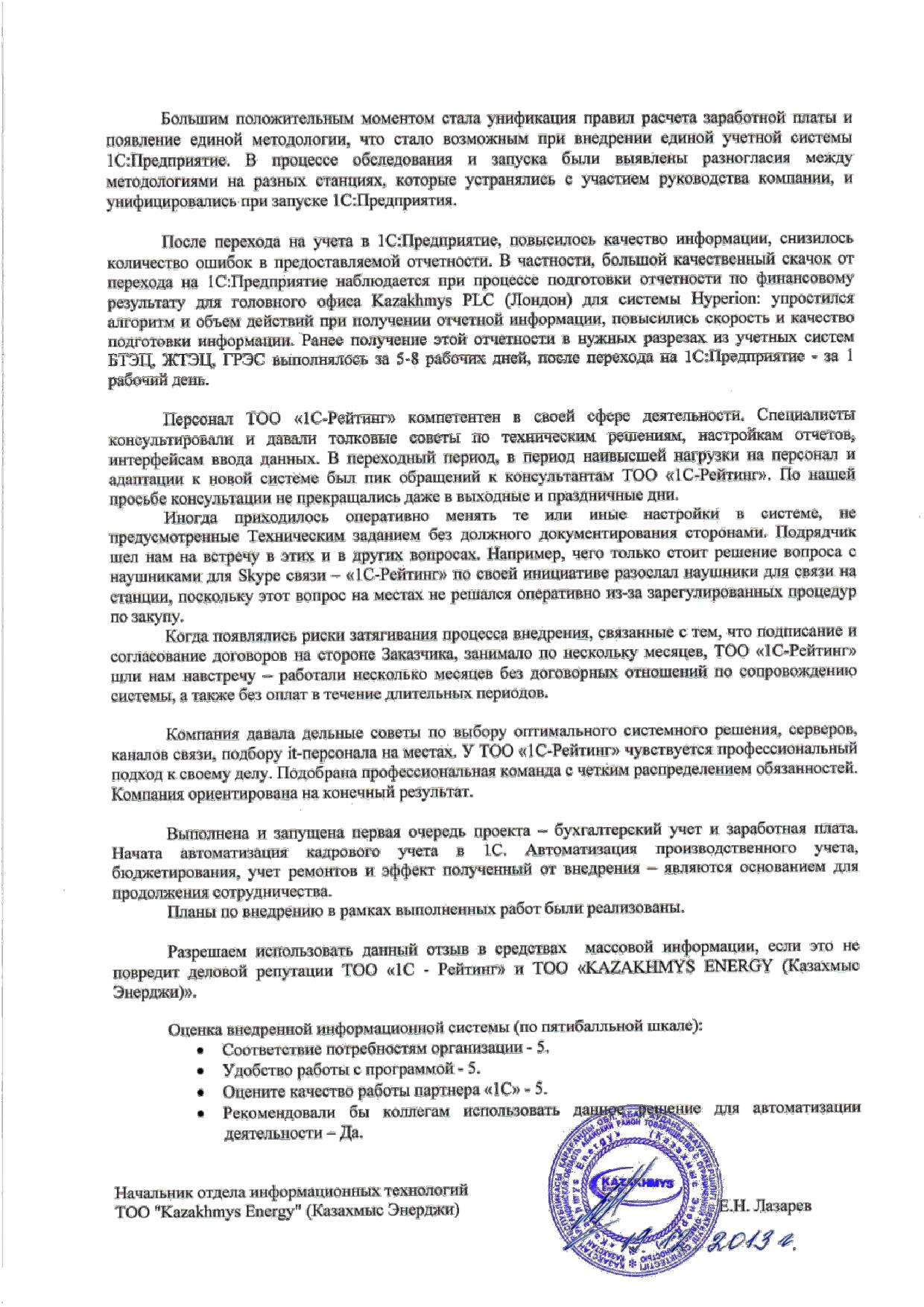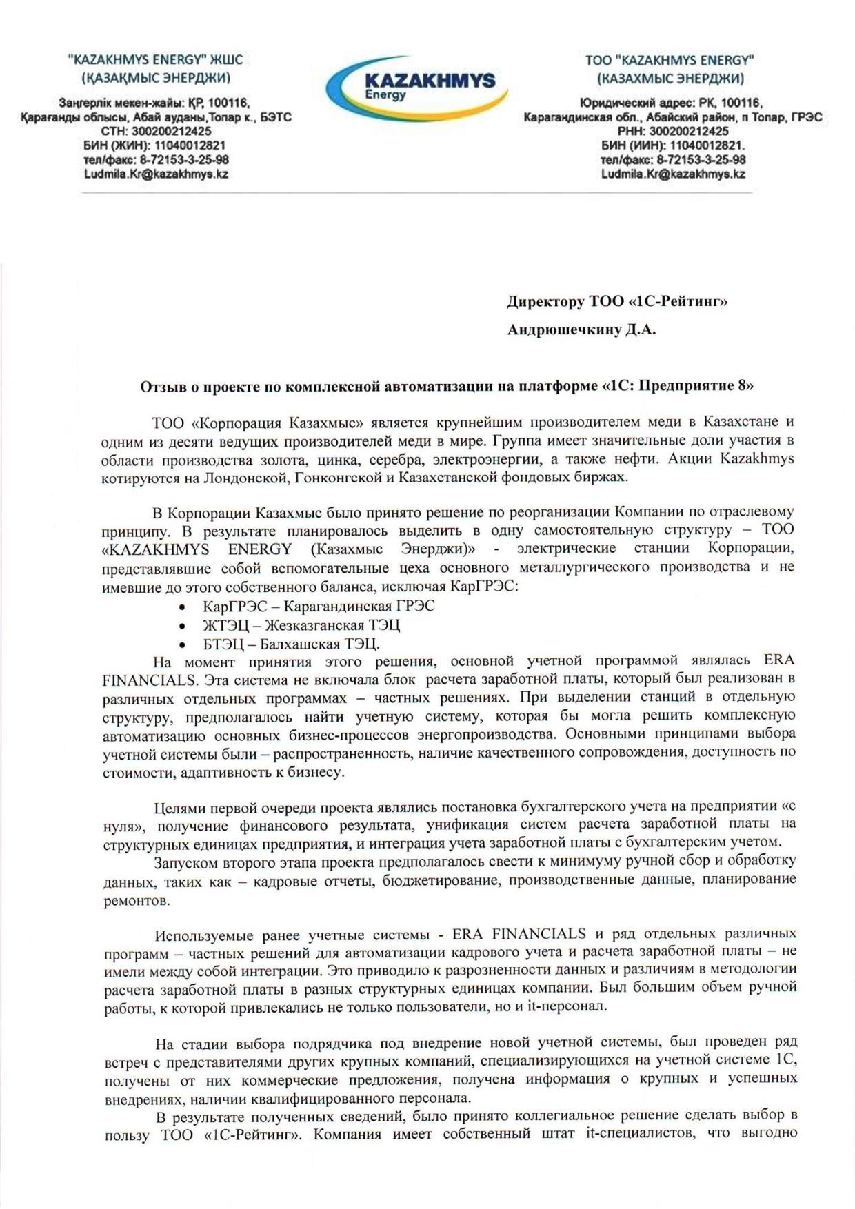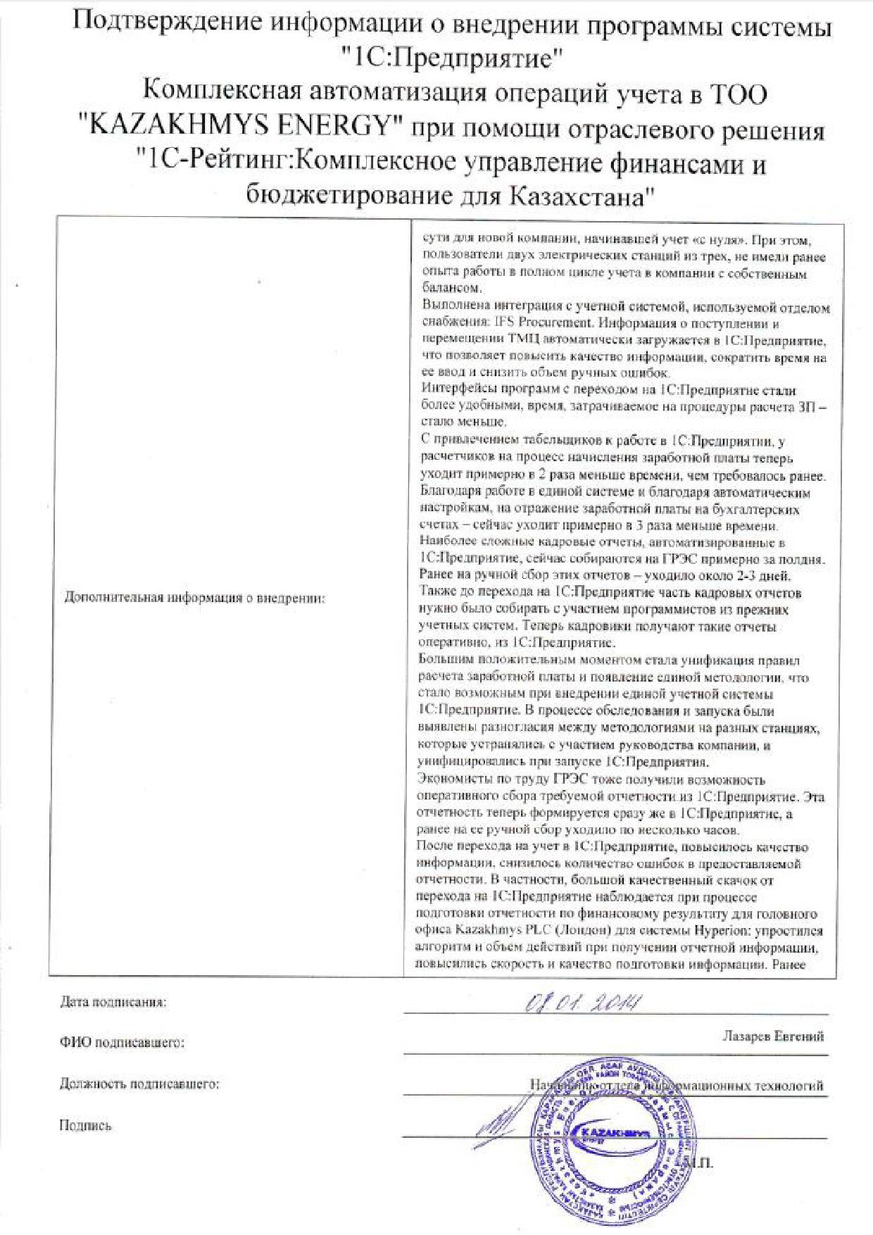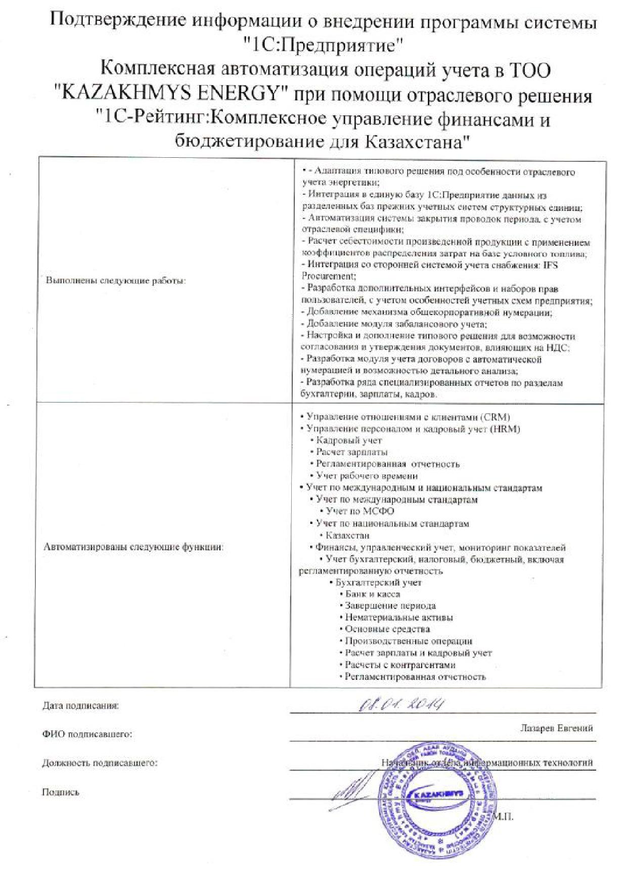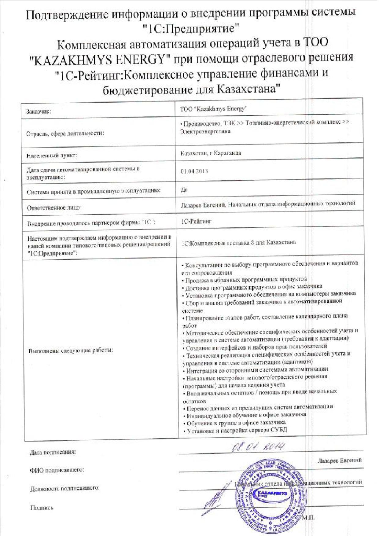 Комплексная автоматизация операций учета в ТОО «KAZAKHMYS ENERGY» при помощи отраслевого решения «1С-Рейтинг: Комплексное управление финансами и бюджетирование для Казахстана»