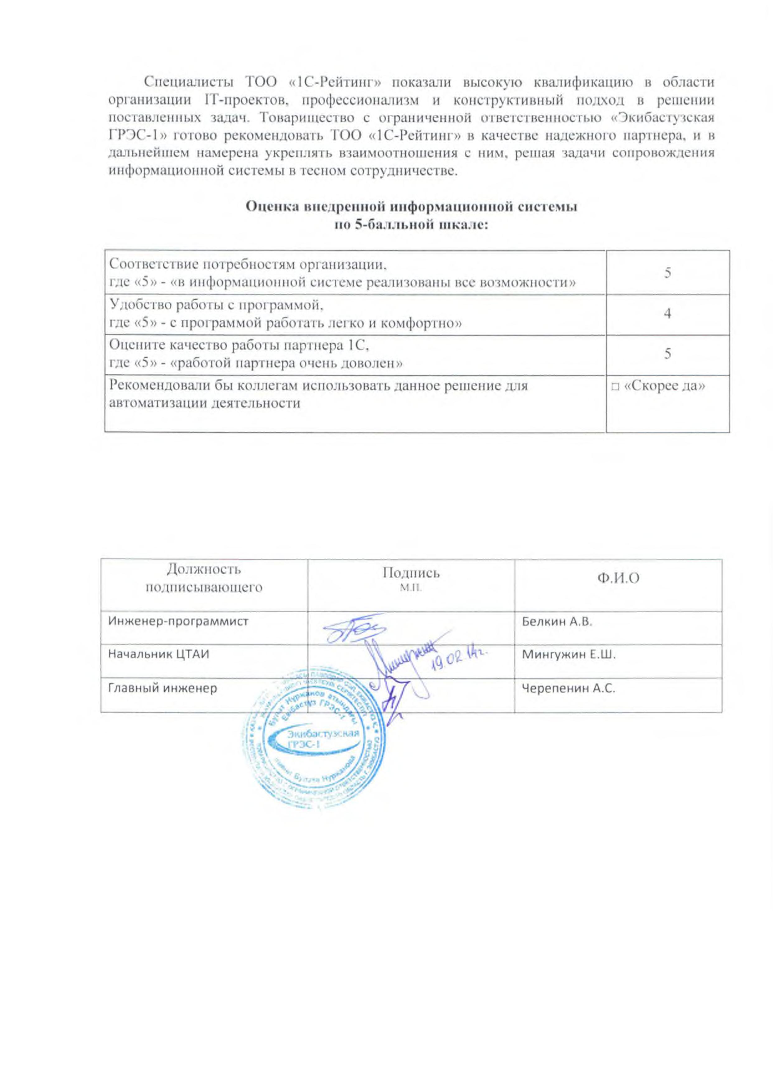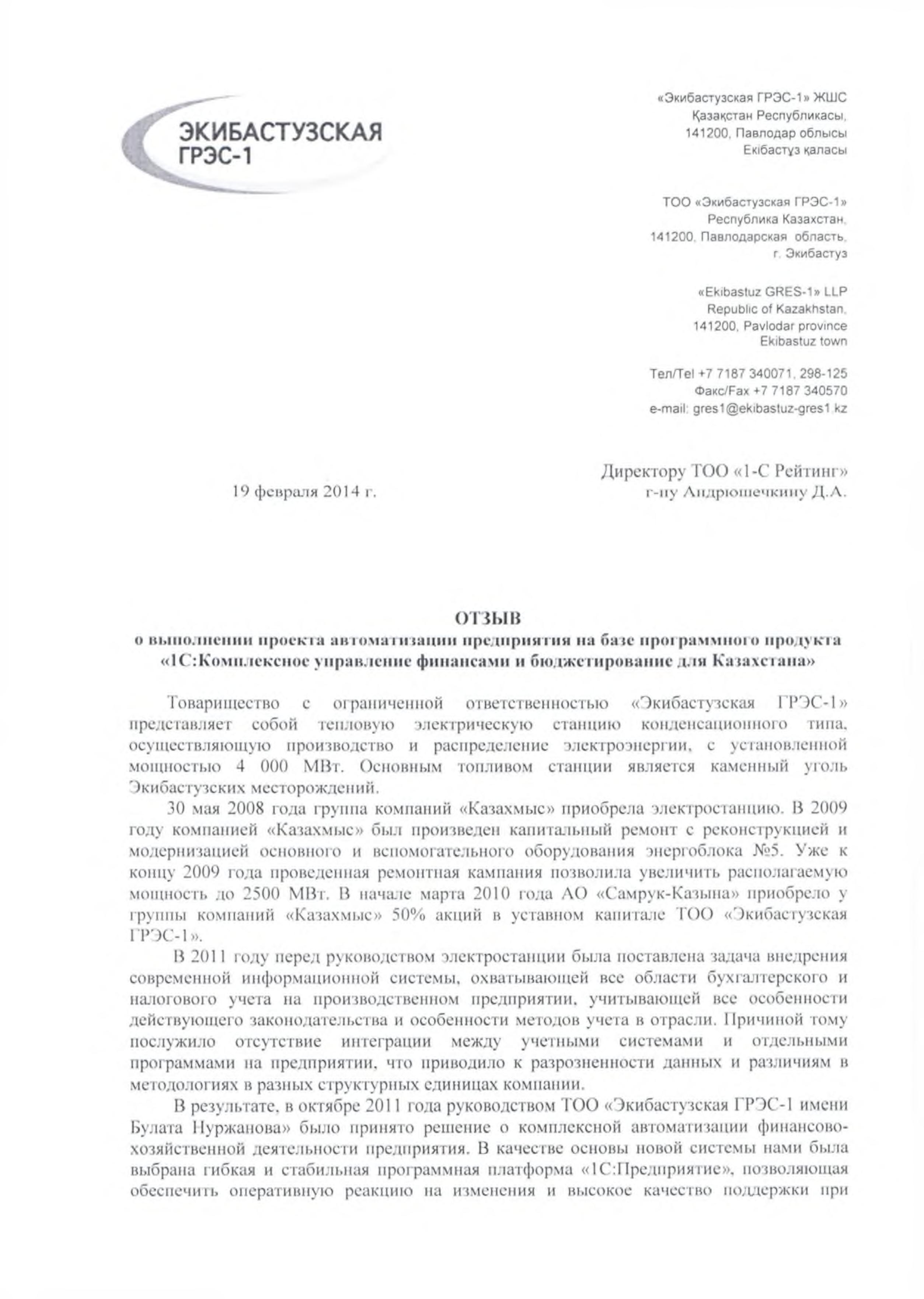 Товарищество с ограниченной ответственностью «Экибастузская ГРЭС-1» представляет собой тепловую электрическую станцию конденсационного типа, сегодня пять из восьми энергоблоков находятся в постоянной работе и могут выработать 2500 МВт. В связи со спецификой деятельности организации в ходе внедрения автоматизирована функция учета продажи электроэнергии. В ходе внедрения так же выполнена интеграция с другими системами на базе «1С:Предприятия» – встроены системы «1С-Рейтинг: Налоговый мониторинг» и «1С-Рейтинг: Управление спецодеждой и инвентарем».