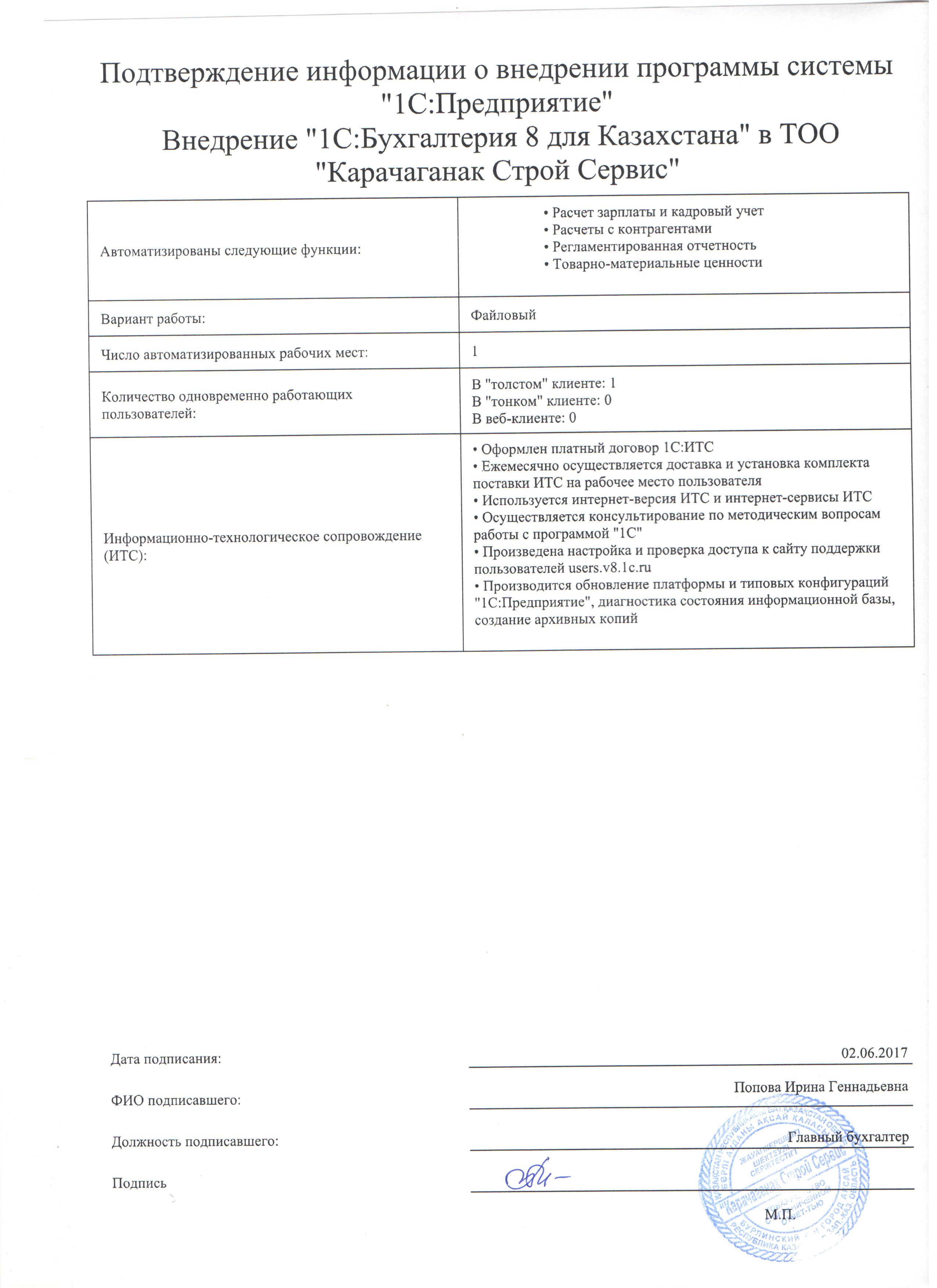 | Внедренное типовое решение: | 1С:Бухгалтерия 8 для Казахстана |