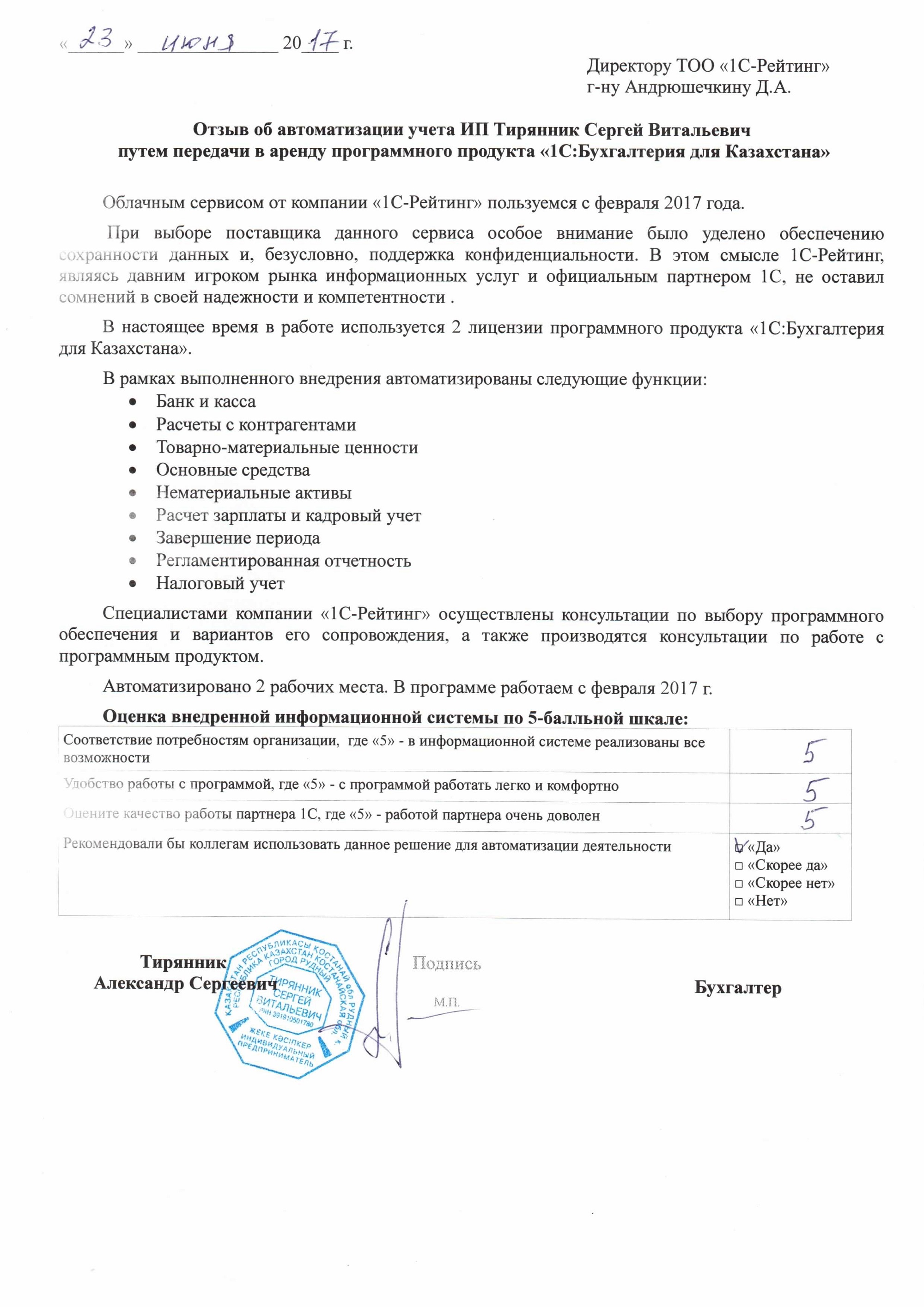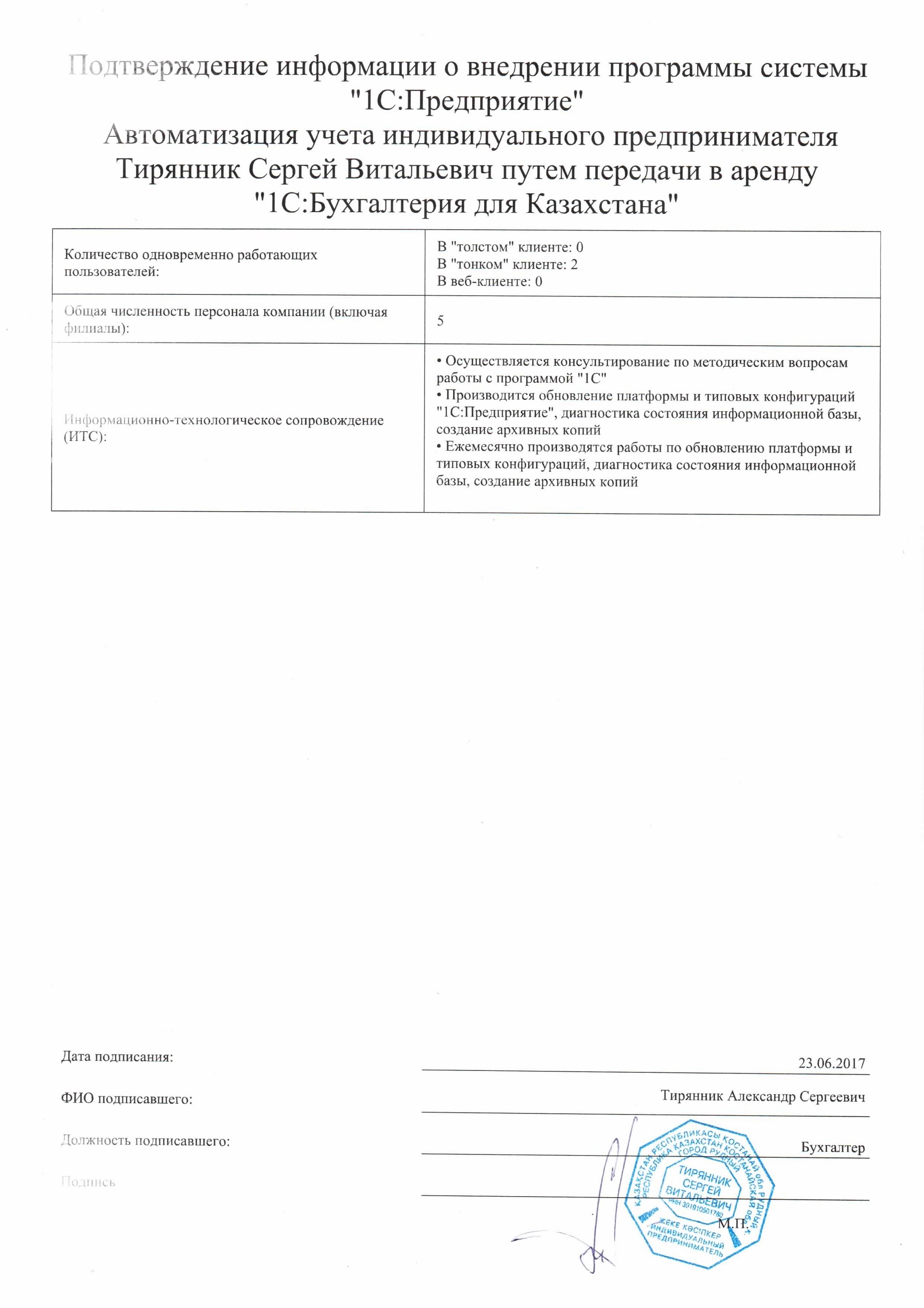 Автоматизация учета индивидуального предпринимателя Тирянник Сергей Витальевич путем передачи в аренду «1С:Бухгалтерия для Казахстана»