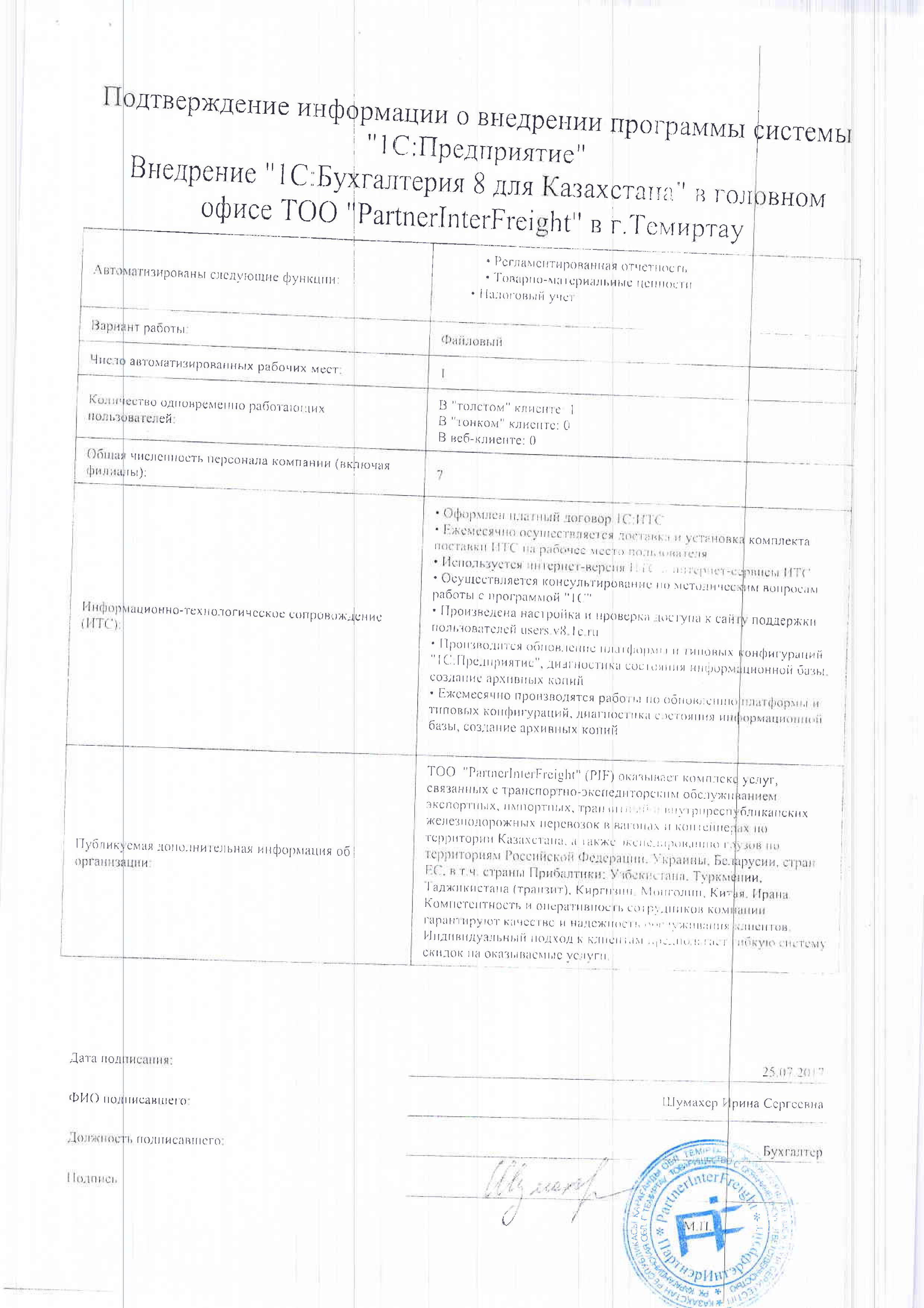 | Внедренное типовое решение: | 1С:Бухгалтерия 8 для Казахстана |