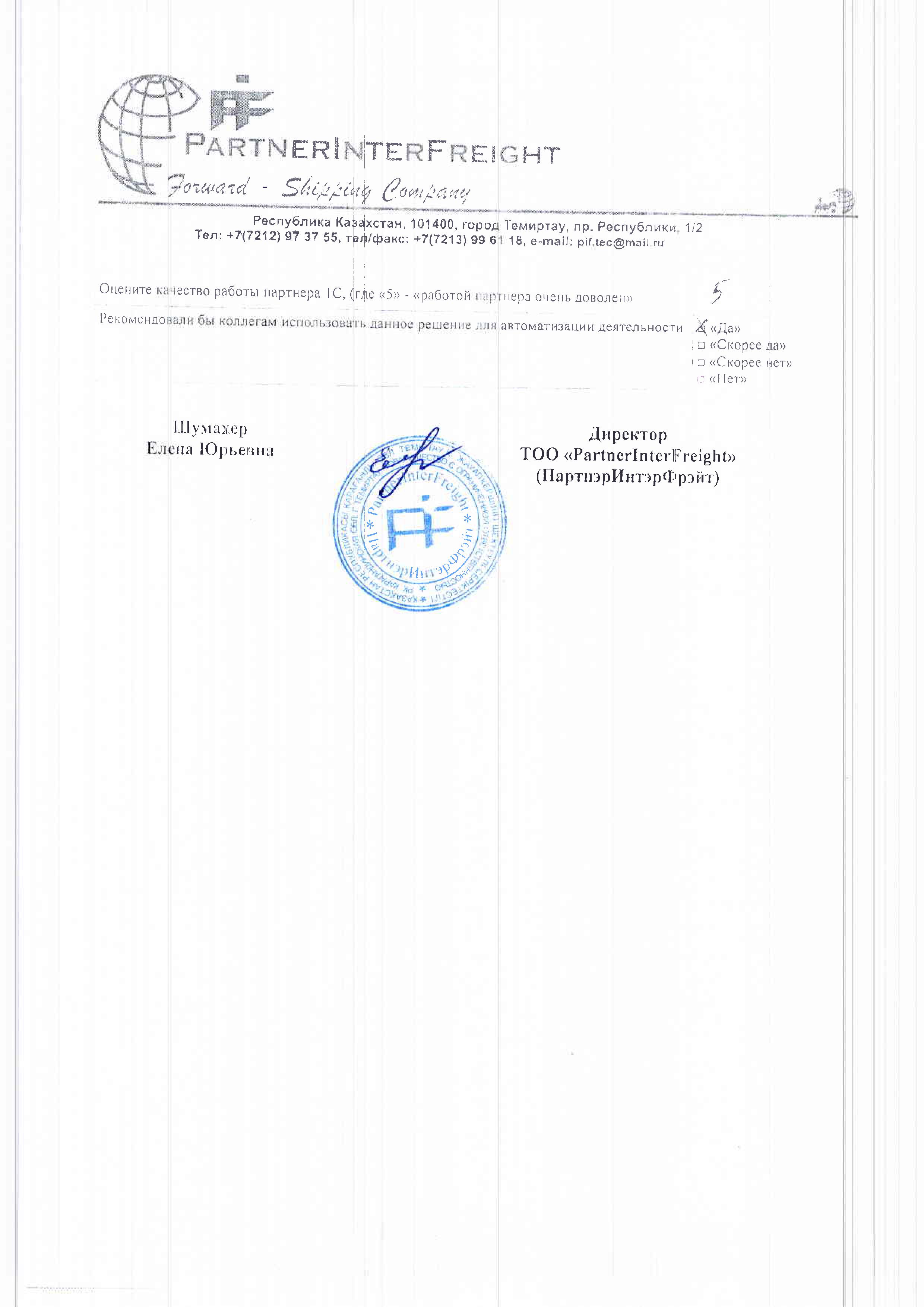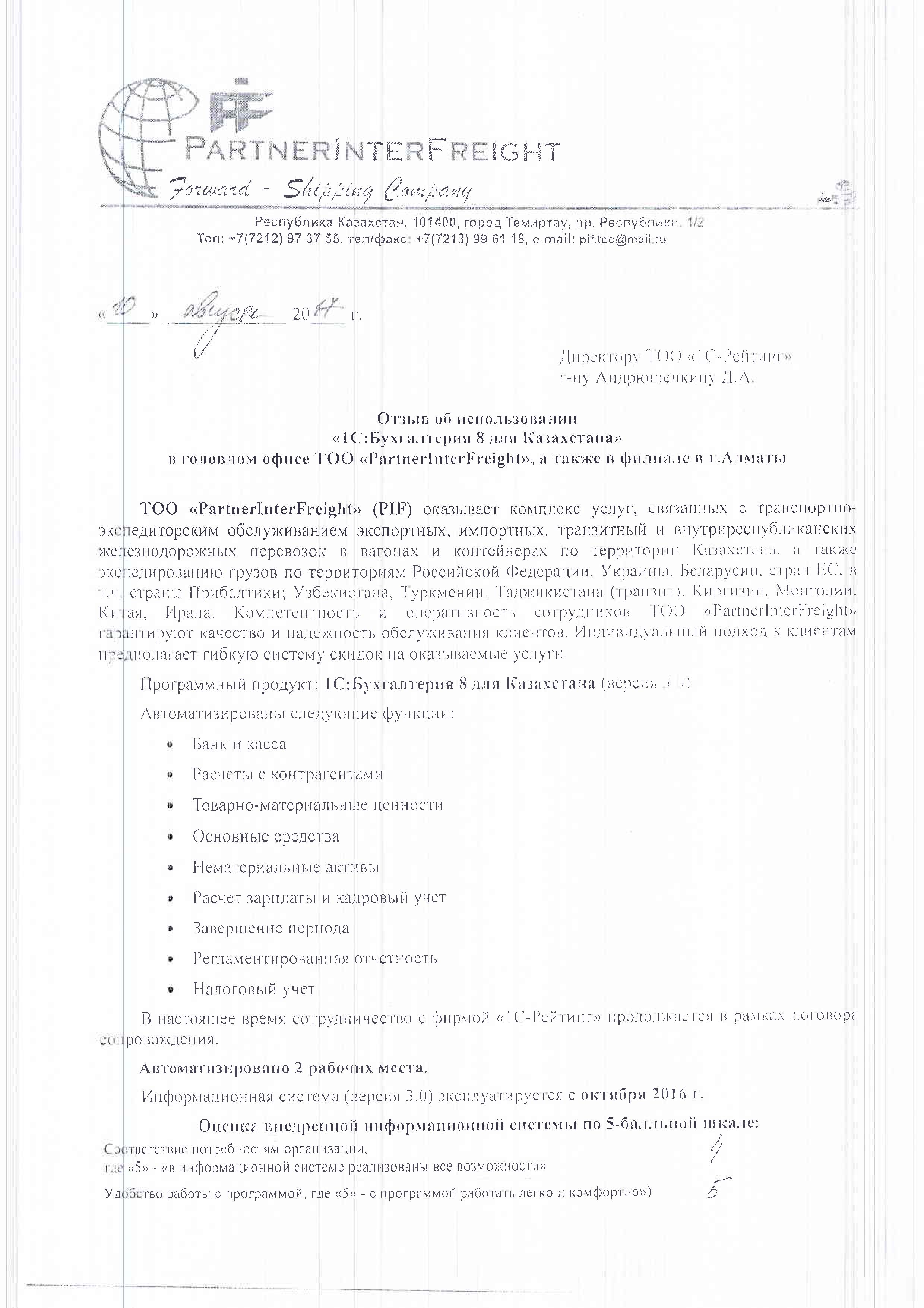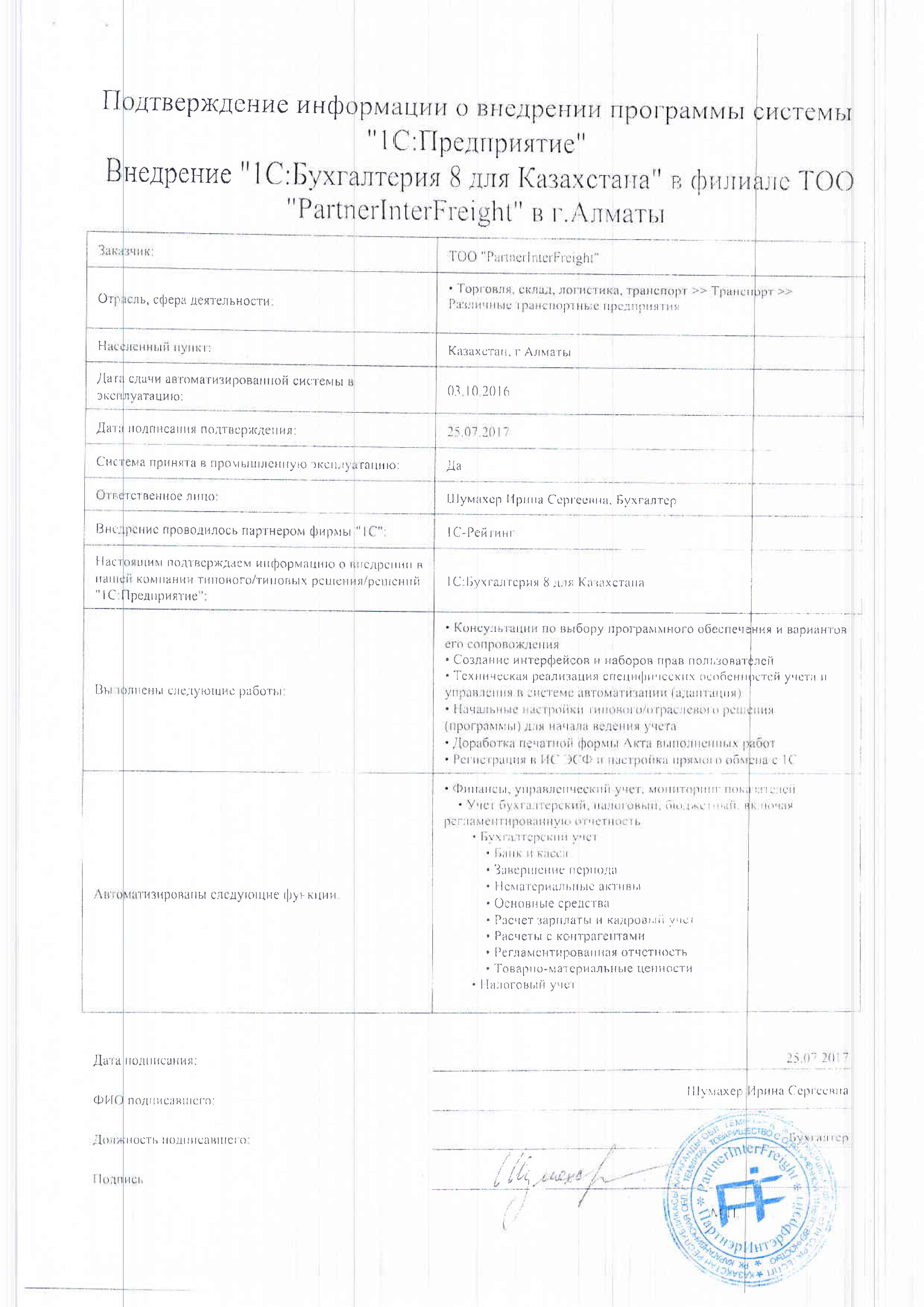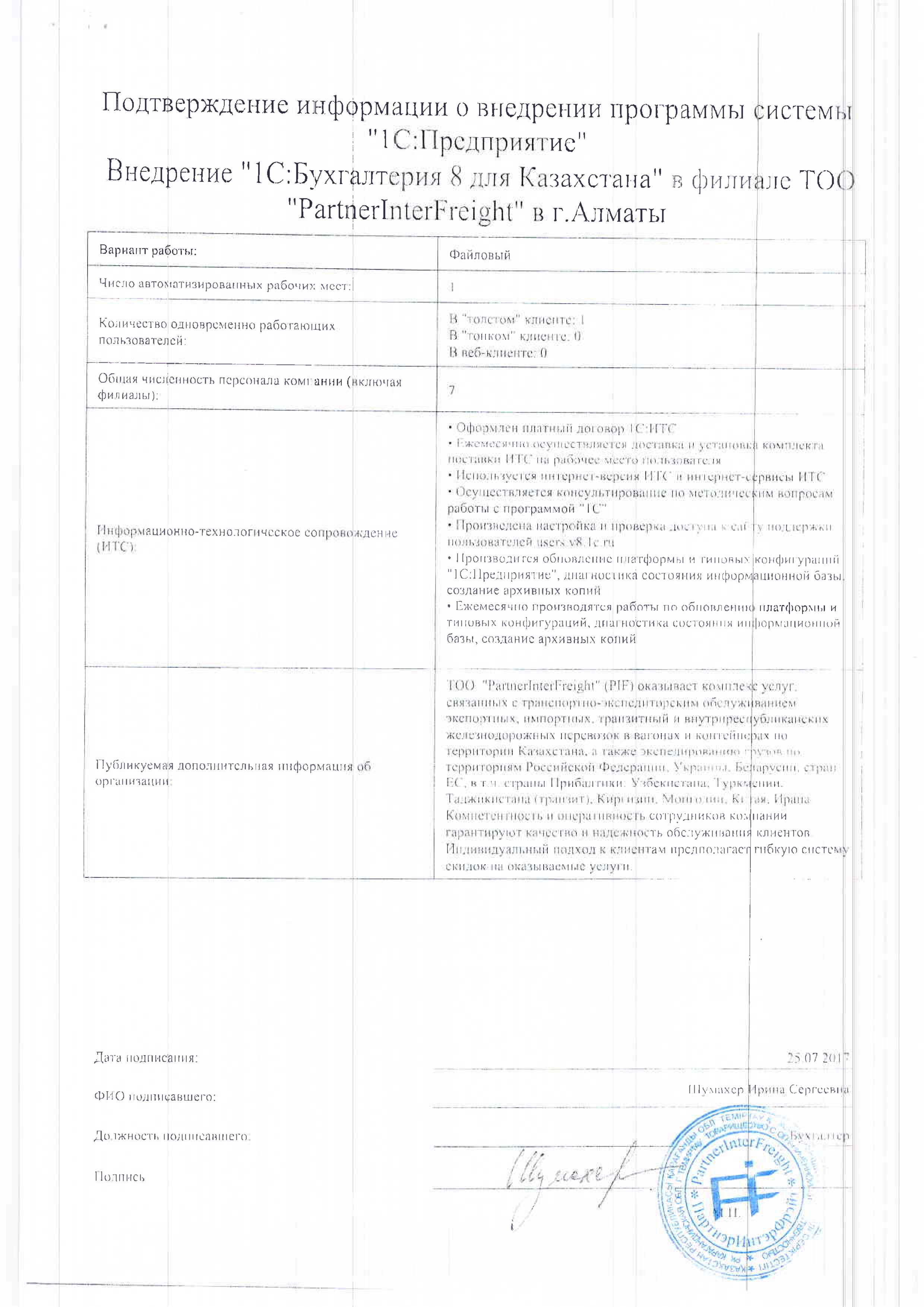 Внедрение «1С:Бухгалтерия 8 для Казахстана» в филиале ТОО «PartnerInterFreight» в г.Алматы