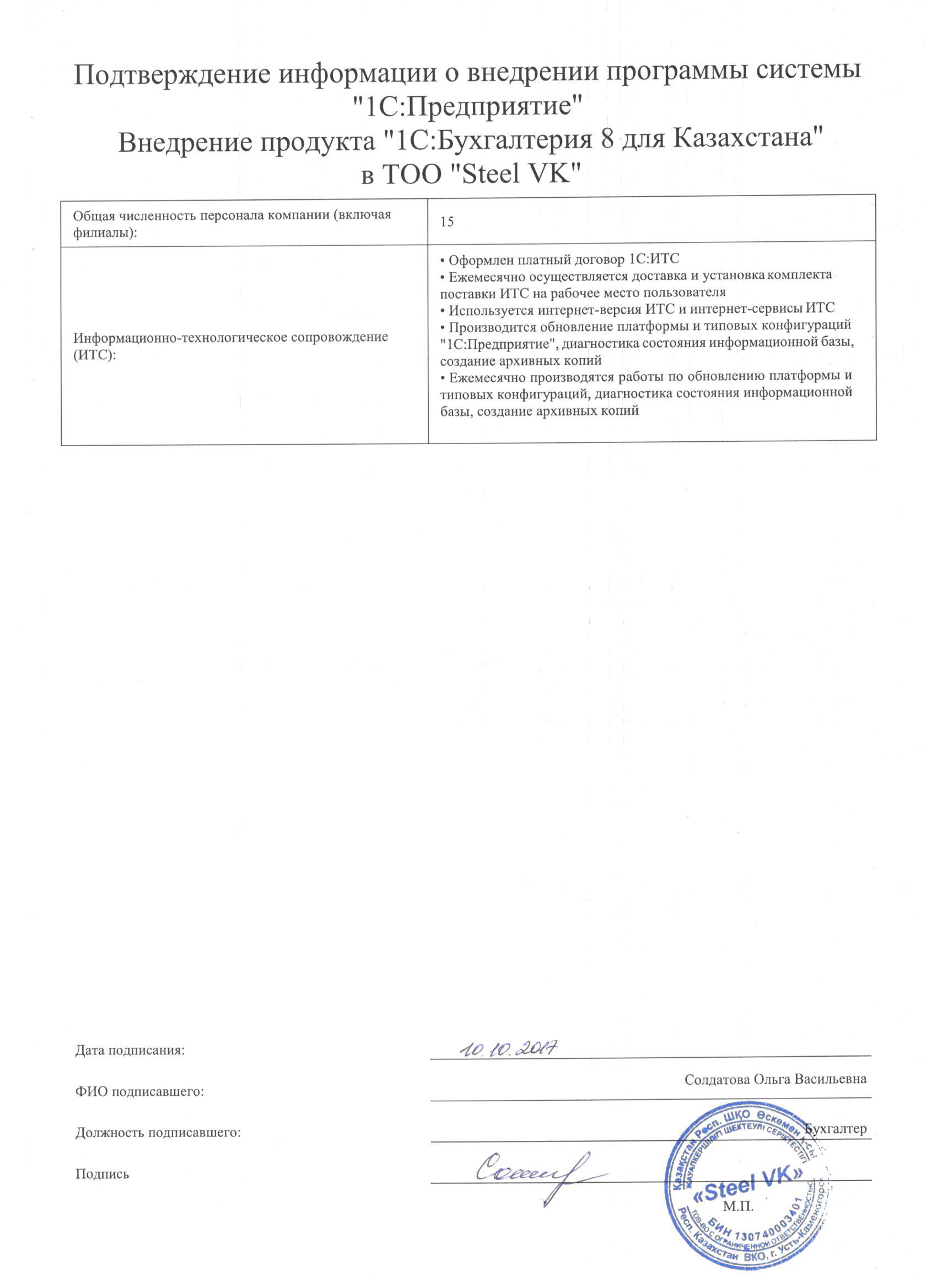 | Внедренное типовое решение: | 1С:Бухгалтерия 8 для Казахстана |