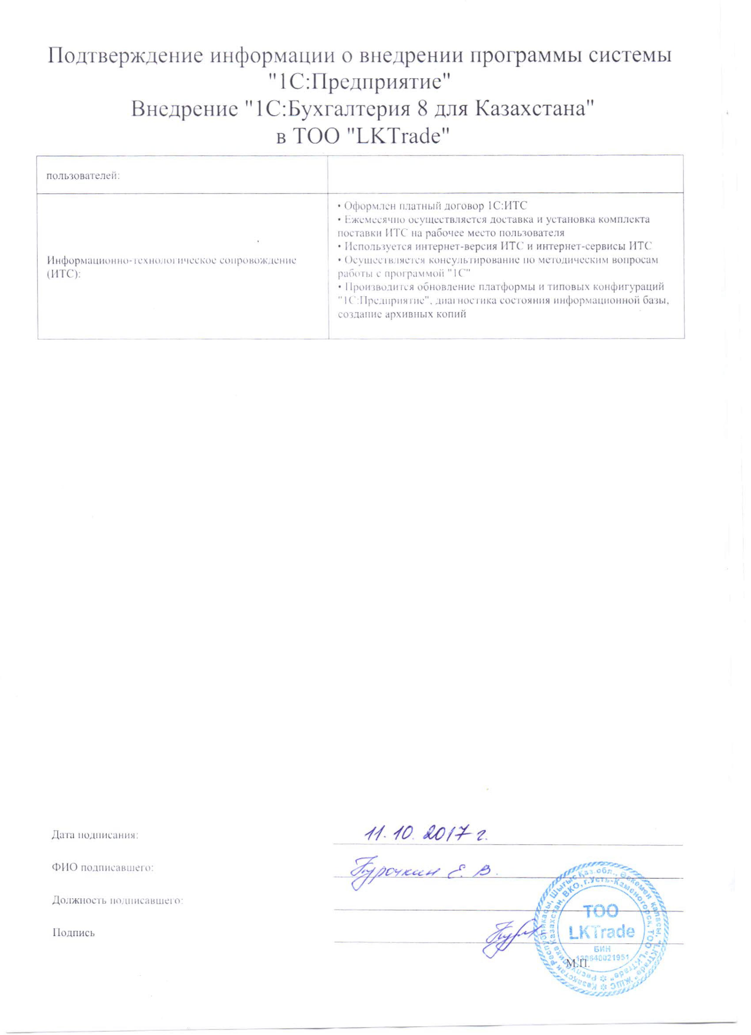 | Внедренное типовое решение: | 1С:Бухгалтерия 8 для Казахстана |