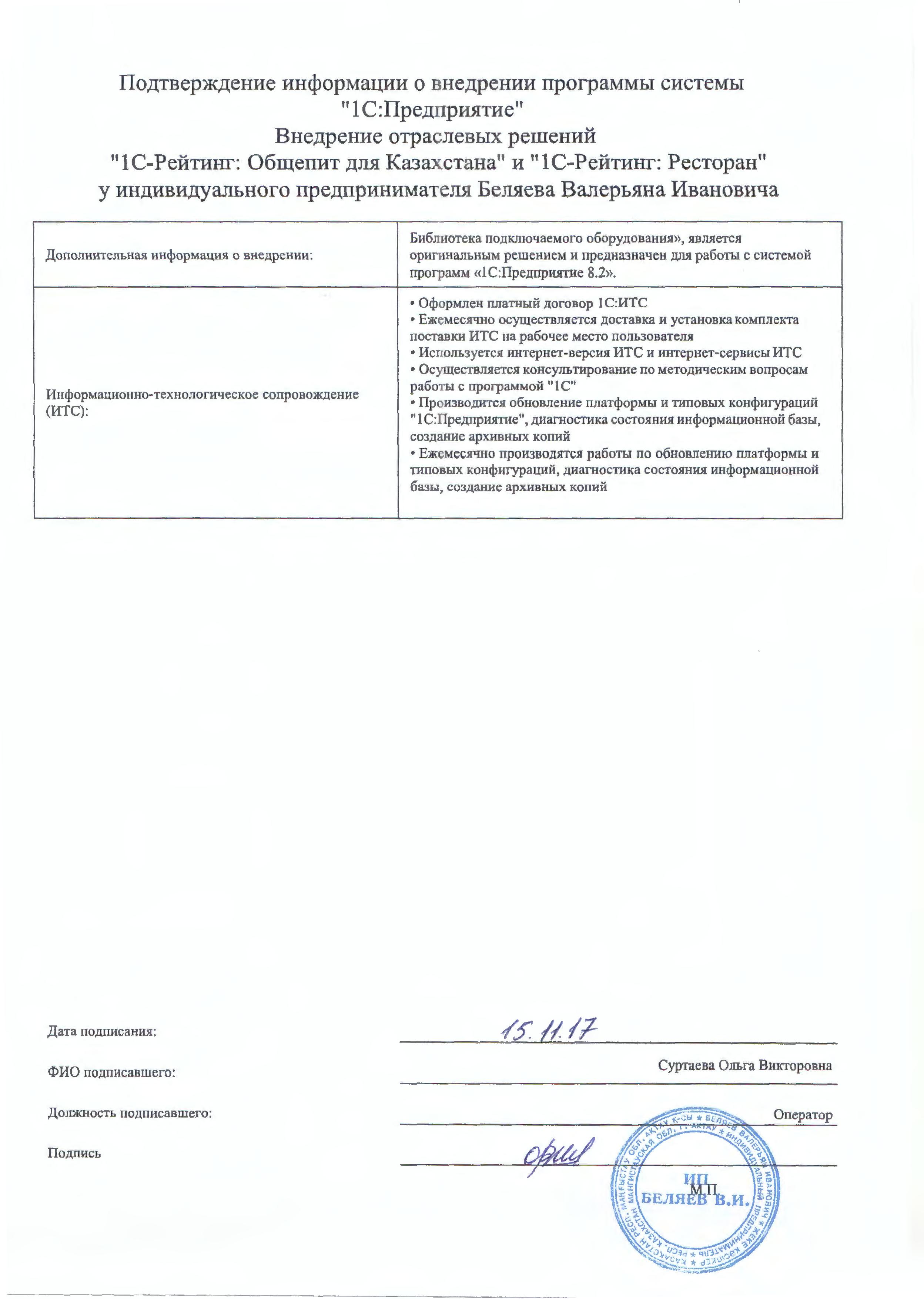 - Ежемесячно производятся работы по обновлению платформы и типовых конфигураций, диагностика состояния информационной базы, создание архивных копий