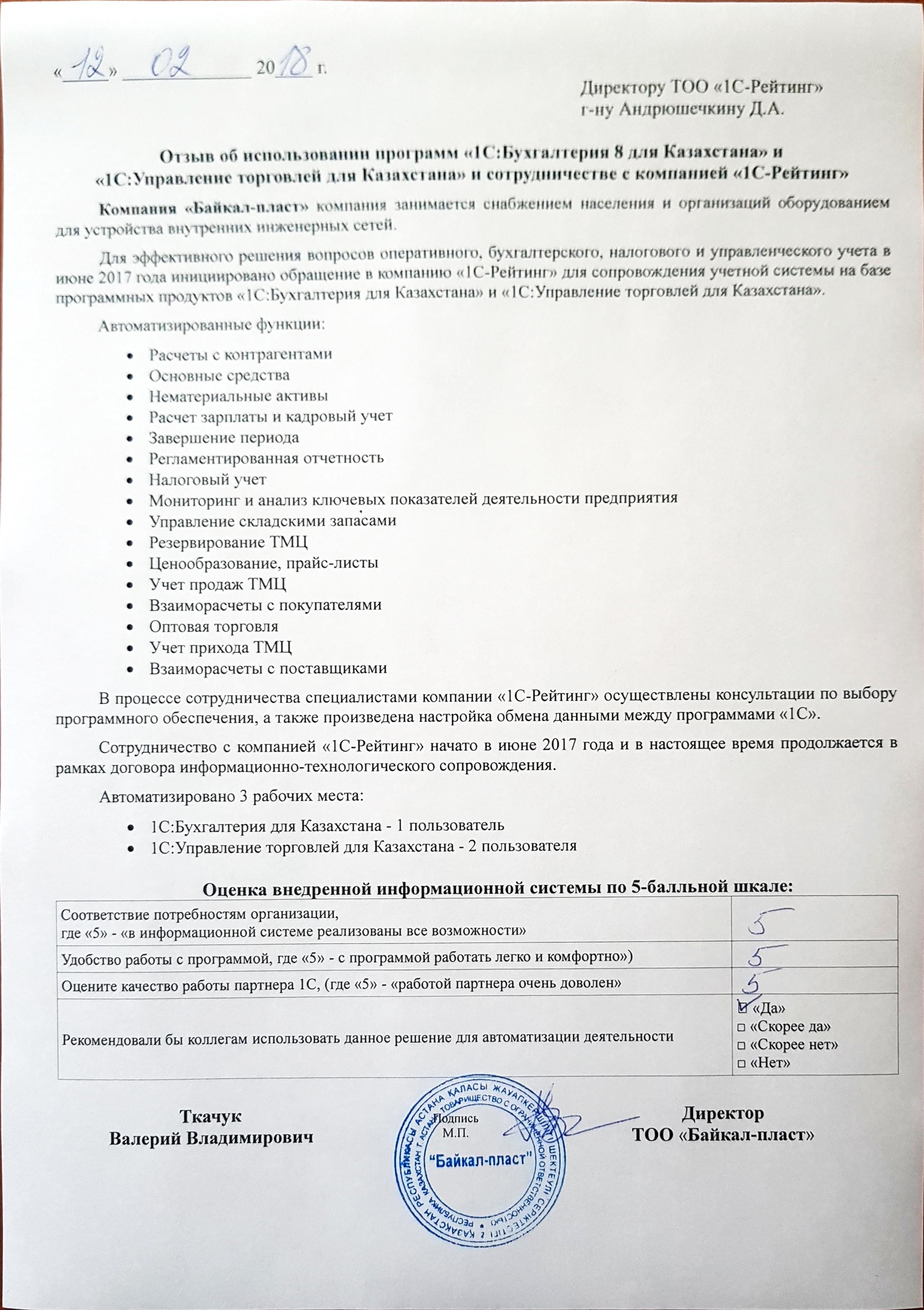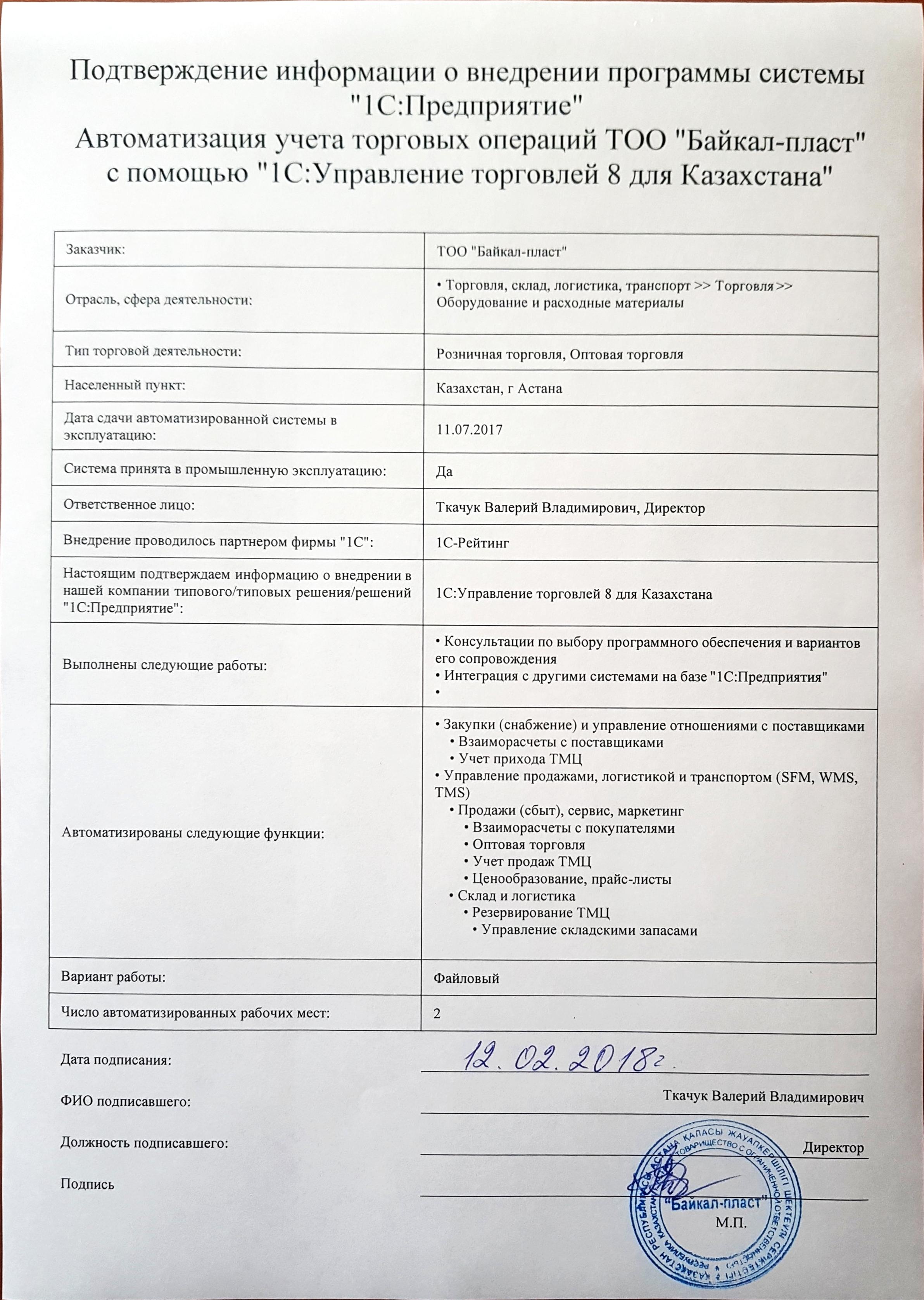 | Внедренное типовое решение: | 1С:Управление торговлей 8 для Казахстана |