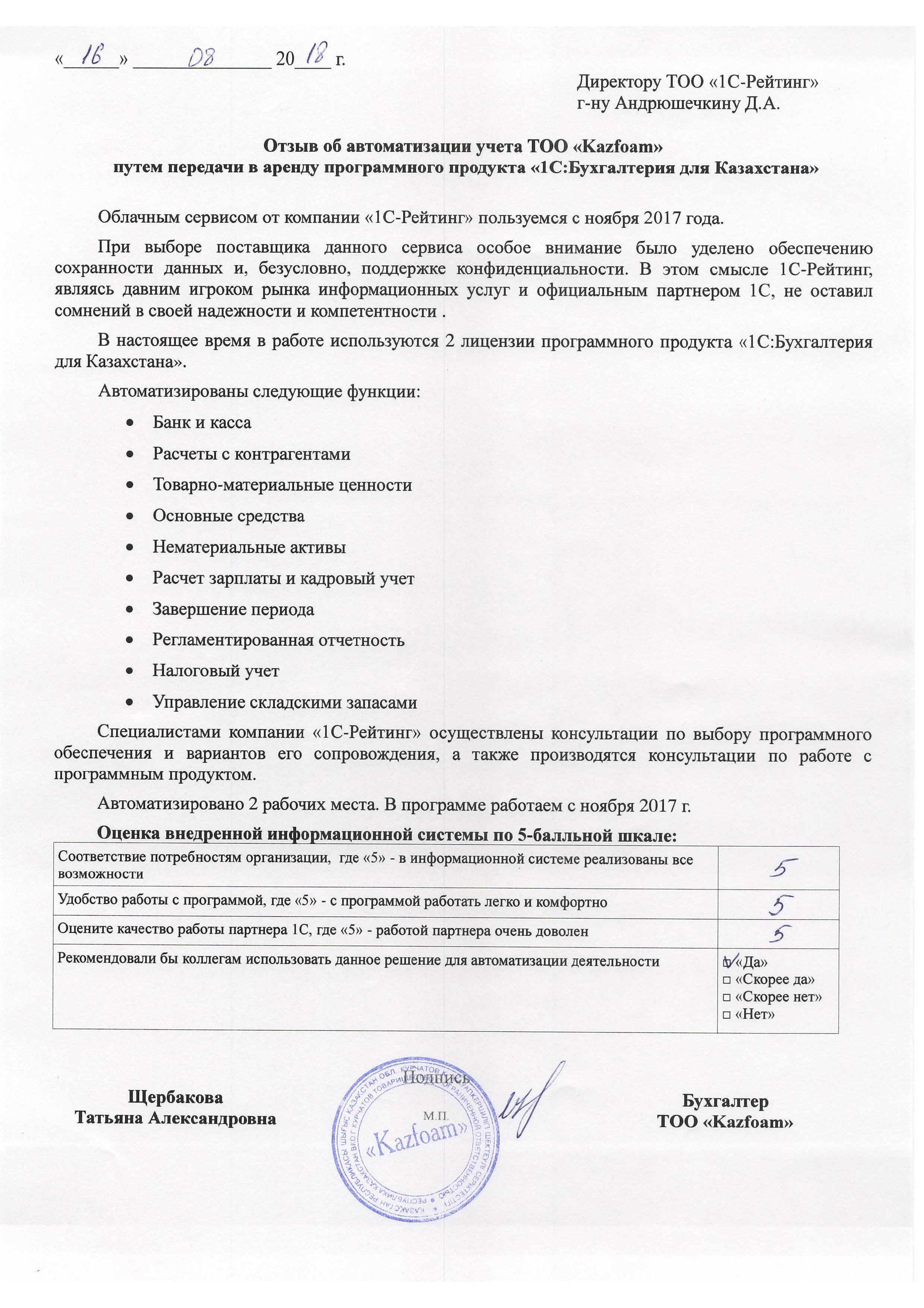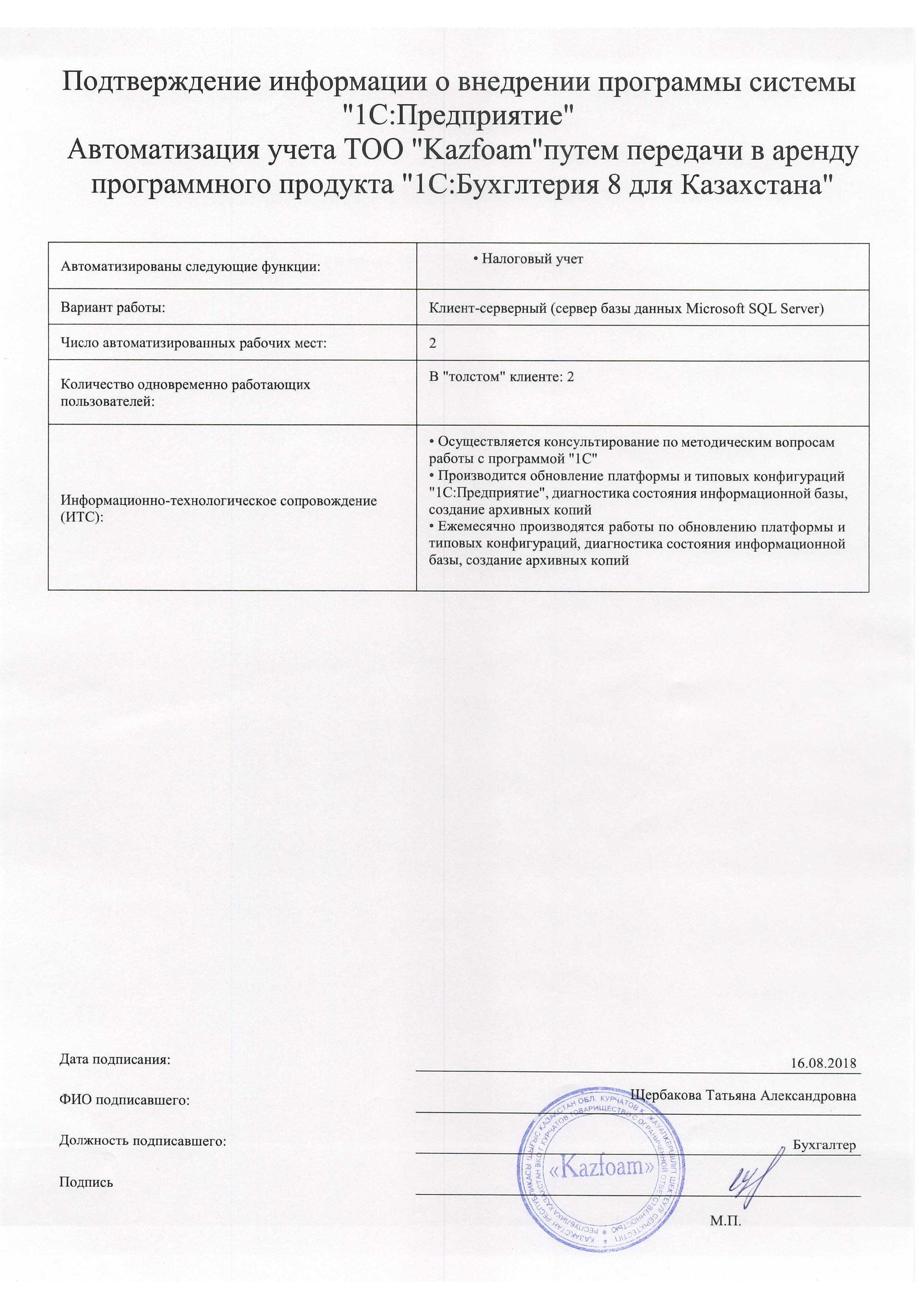 | Арендованное типовое решение: | 1С:Бухгалтерия для Казахстана |