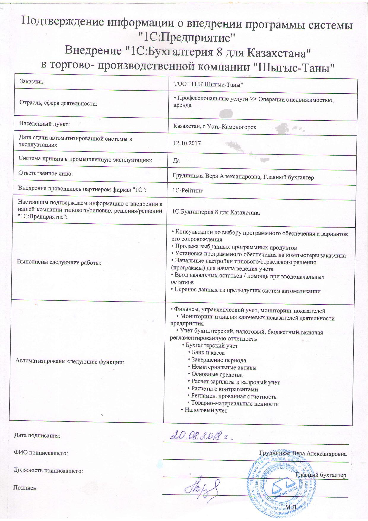 | Внедренное типовое решение: | 1С:Бухгалтерия 8 для Казахстана |