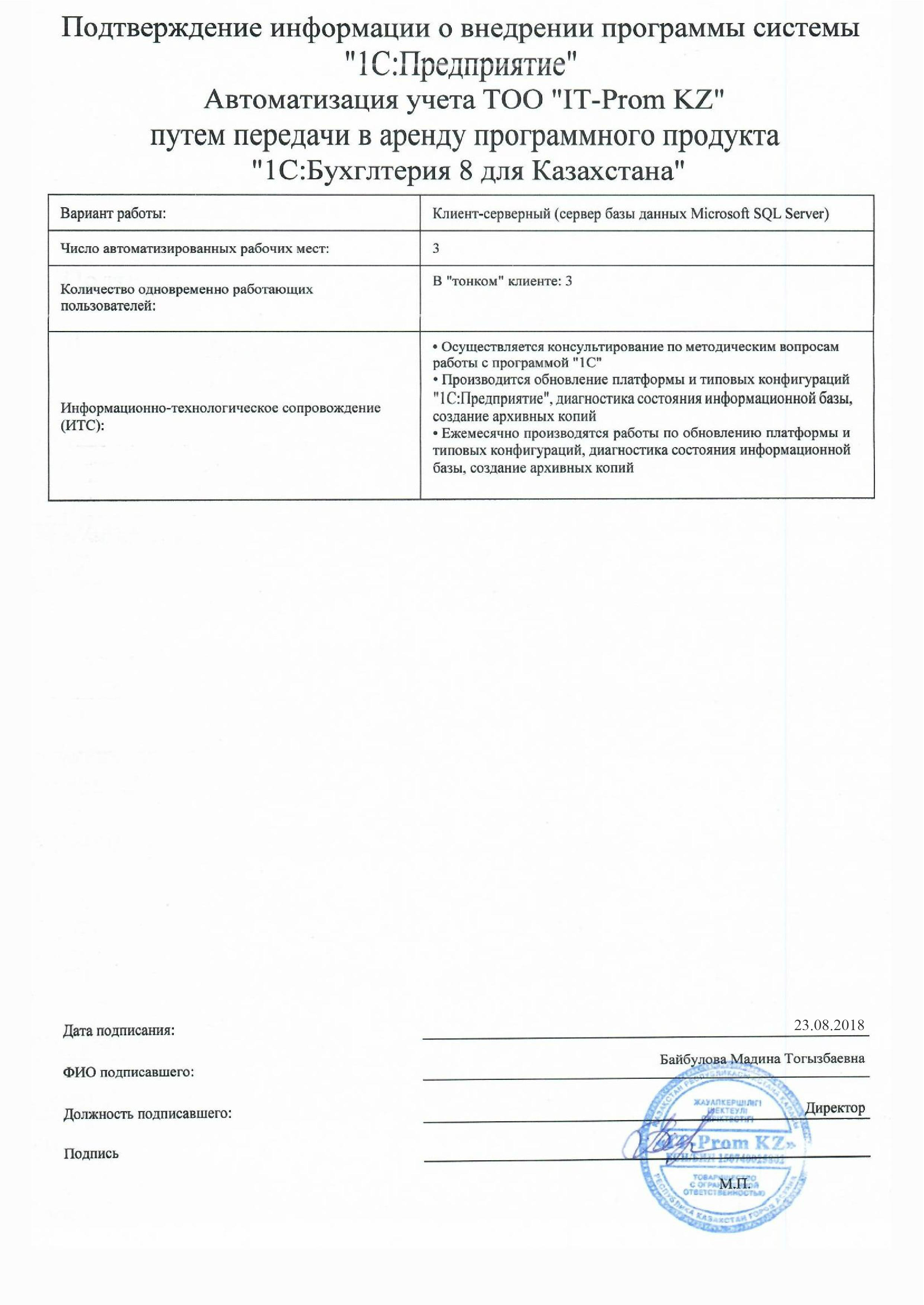 | Арендованное типовое решение: | 1С:Бухгалтерия для Казахстана |