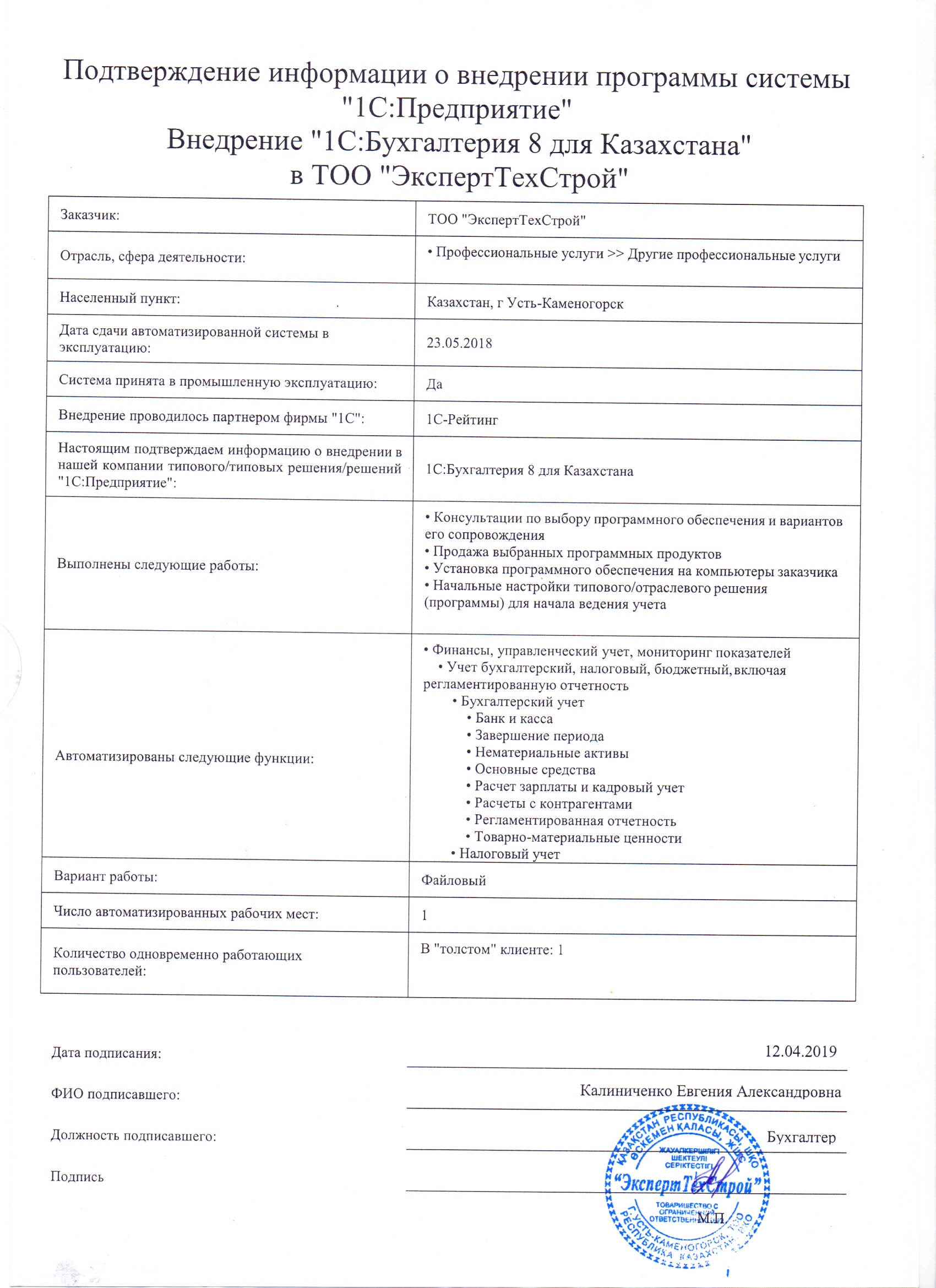 | Внедренное типовое решение: | 1С:Бухгалтерия 8 для Казахстана |