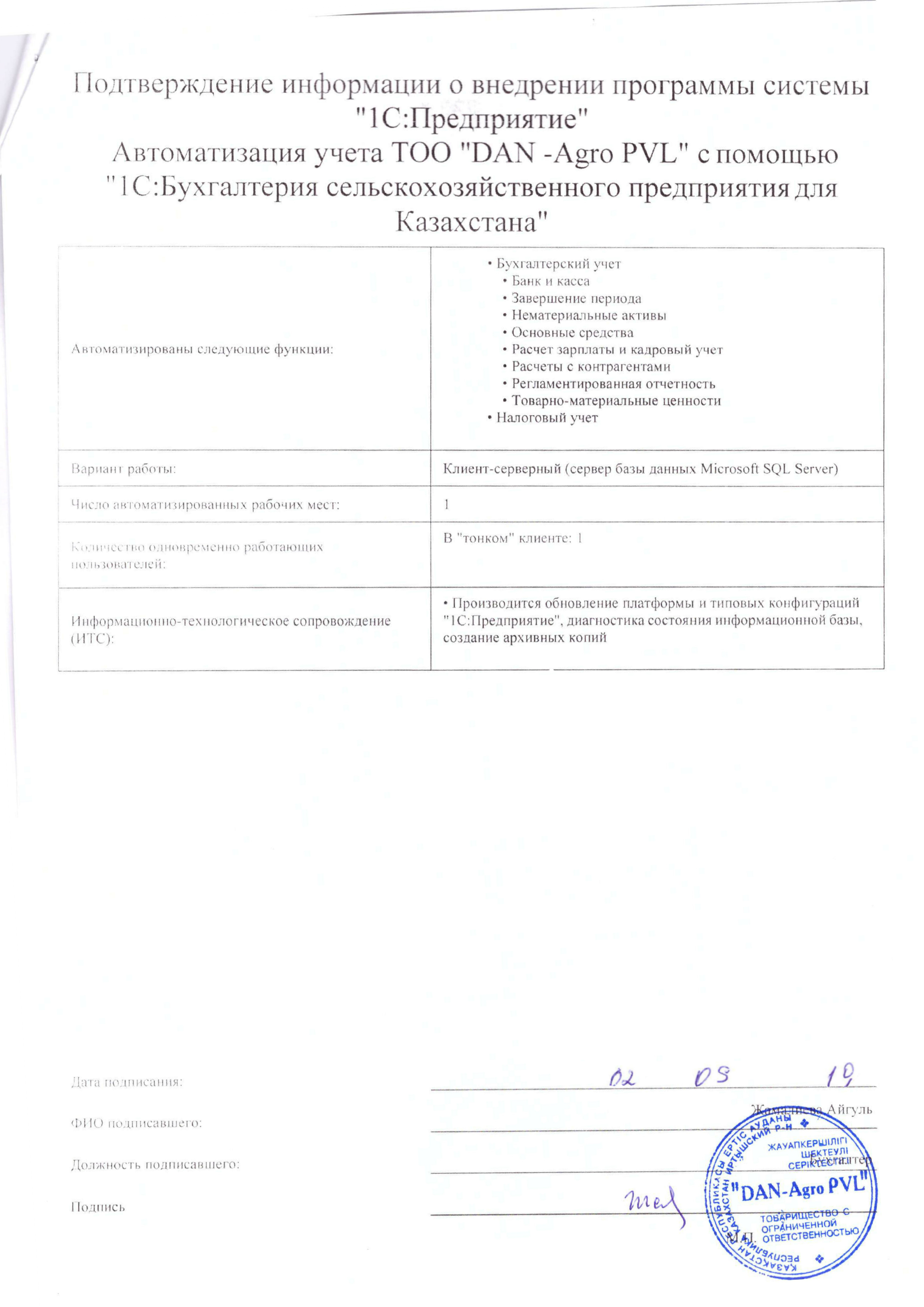 Автоматизация учета ТОО «DAN -Agro PVL» с помощью «1С:Бухгалтерия сельскохозяйственного предприятия для Казахстана»