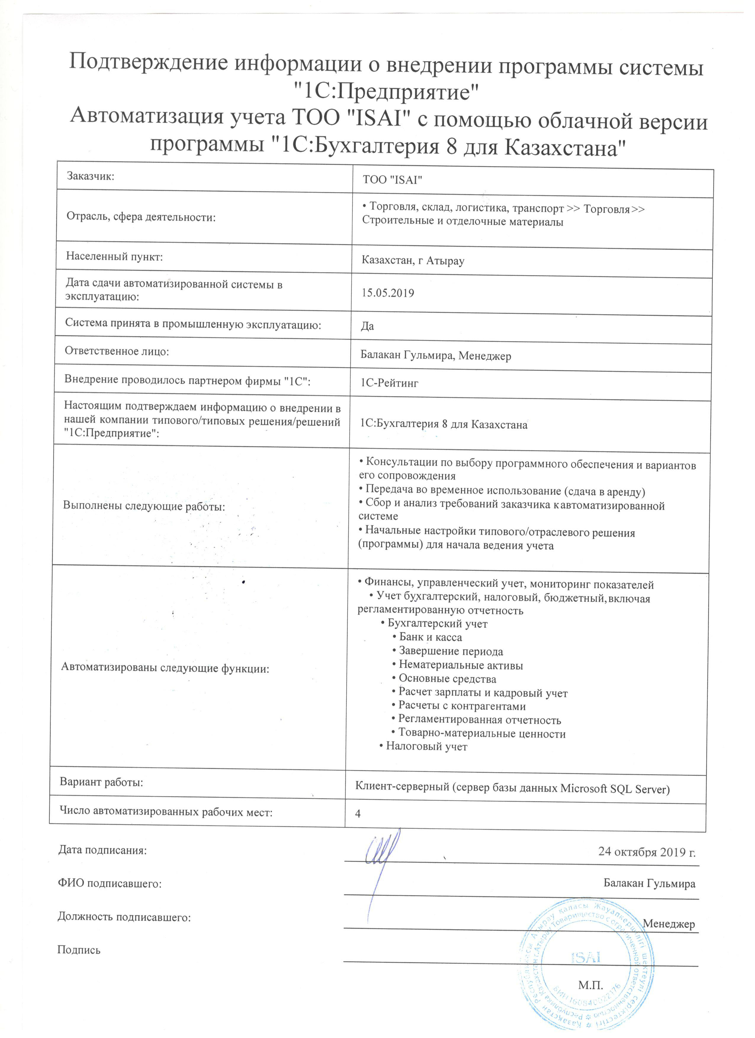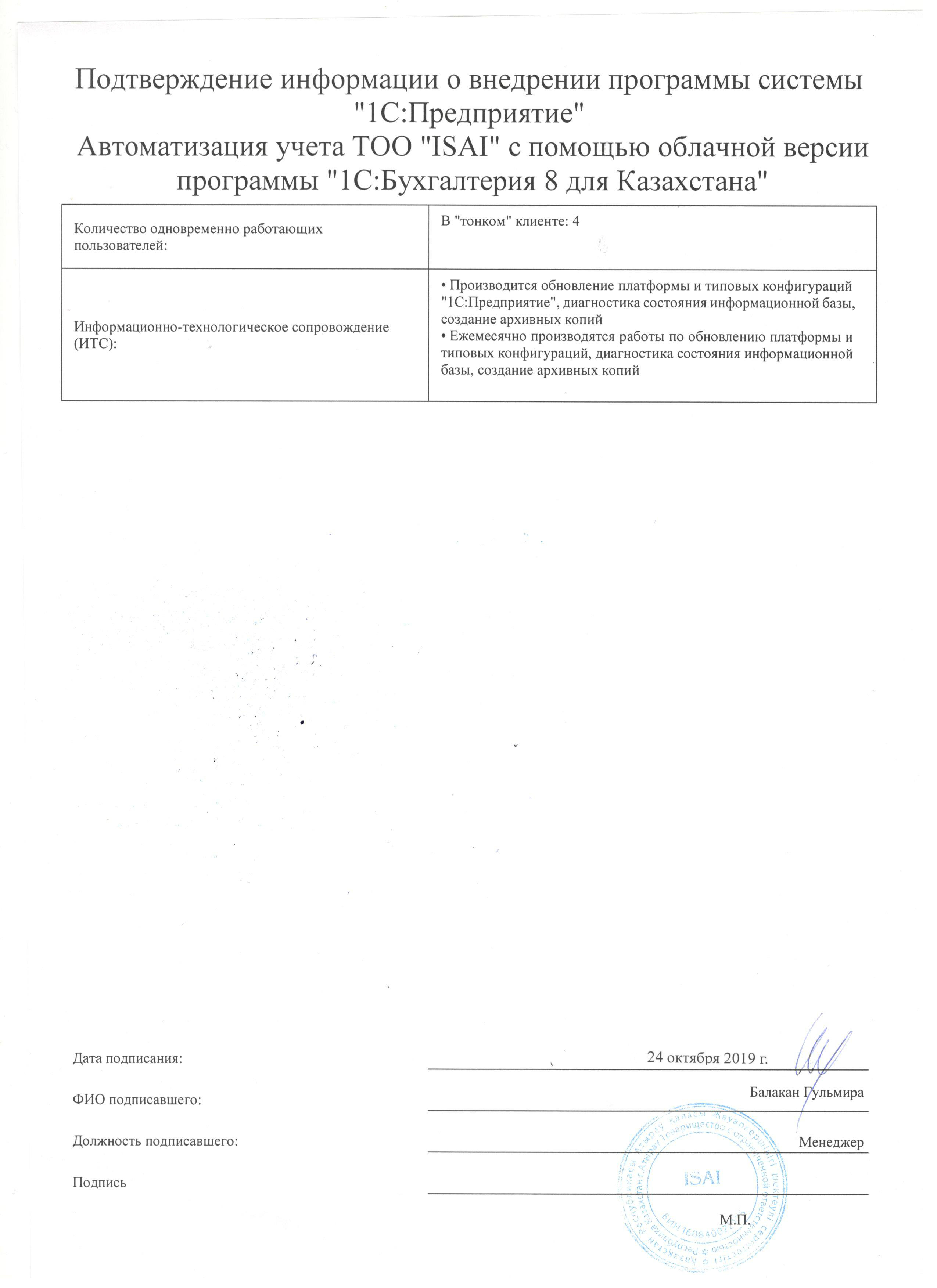 | Арендованное типовое решение: | 1С:Бухгалтерия для Казахстана |