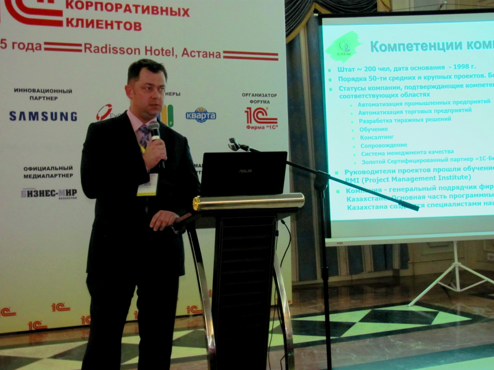 12 ноября 2015 года в Астане прошел Первый казахстанский 1С Форум для корпоративных клиентов. Мероприятие было посвящено обсуждению новейших разработок фирмы «1С» для автоматизации учета и процессов крупных предприятий, групп компаний и холдингов, новейших подходов к решению задач бизнеса с помощью решений «1С», направлений развития технологий.