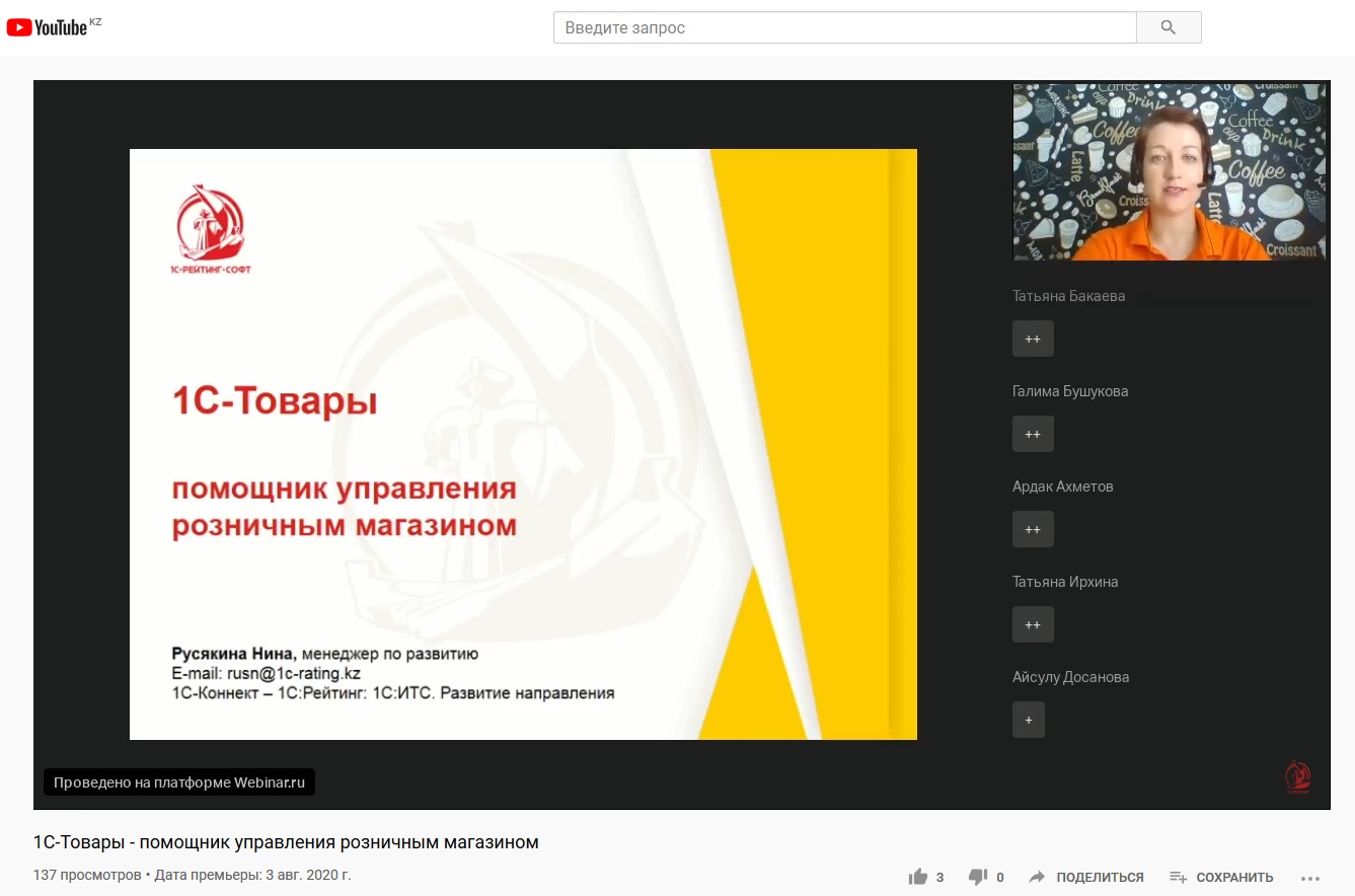 Вебинар вела Нина Русякина, менеджер по развитию партнерской сети отдела дистрибьюции ГК 1С-Рейтинг, видеозапись доступна всем. Нина подробно рассказала об индикаторах контроля работы продуктового магазина, тарифах на подключение сервиса и программных продуктах, в которых реализован данный сервис.