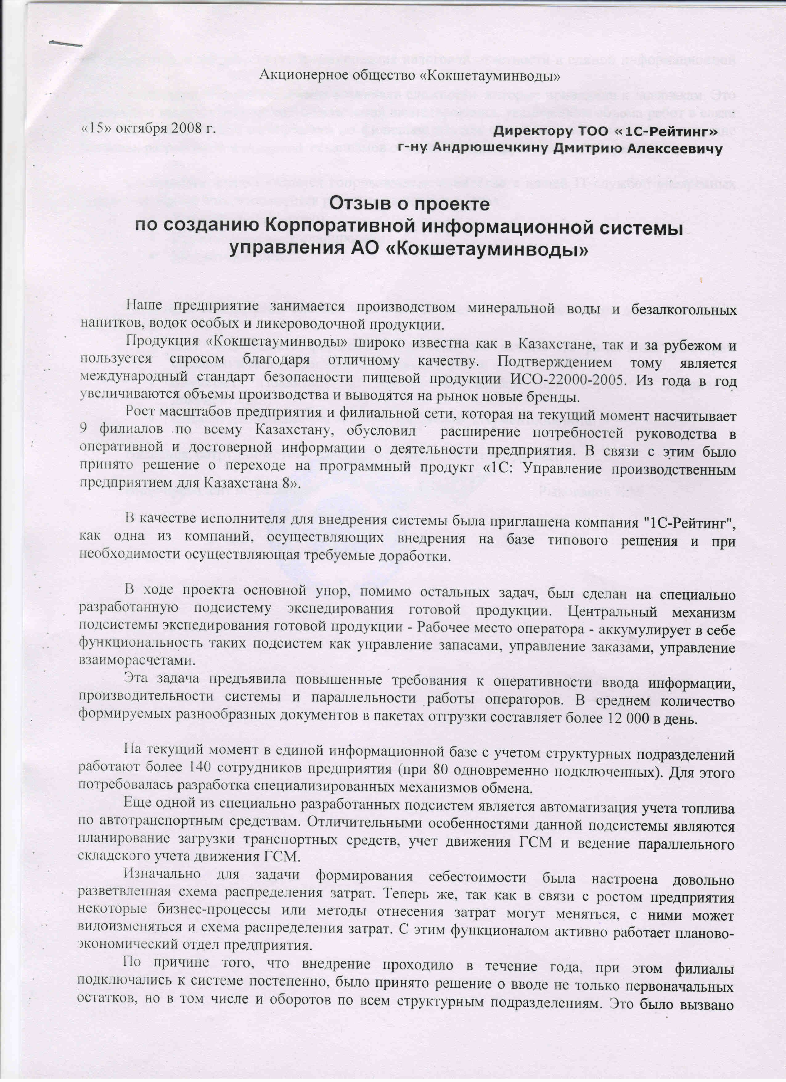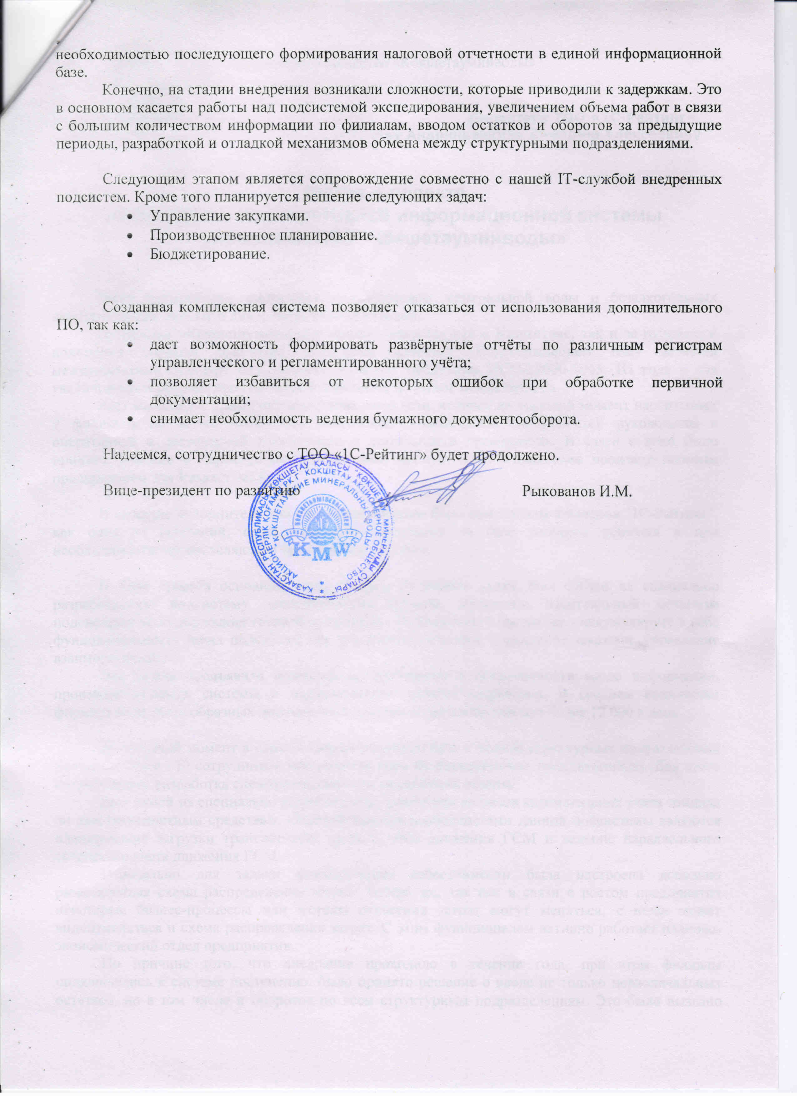 «Созданная комплексная система позволила отказаться от использования дополнительного ПО. Внедренная система дает возможность формировать развёрнутые отчёты по различным регистрам управленческого и регламентированного учёта; позволяет избавиться от ошибок при обработке первичной документации; снимает необходимость ведения бумажного документооборота. Надеемся, сотрудничество с ТОО «1С-Рейтинг» будет продолжено».