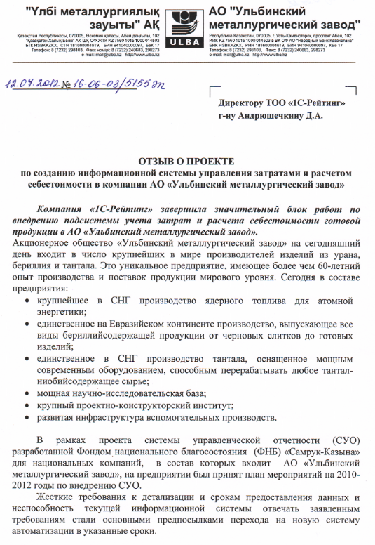 Компания «1С-Рейтинг» завершила значительный блок работ по внедрению подсистемы учета затрат и расчета себестоимости готовой продукции на предприятии АО «Ульбинский металлургический завод».