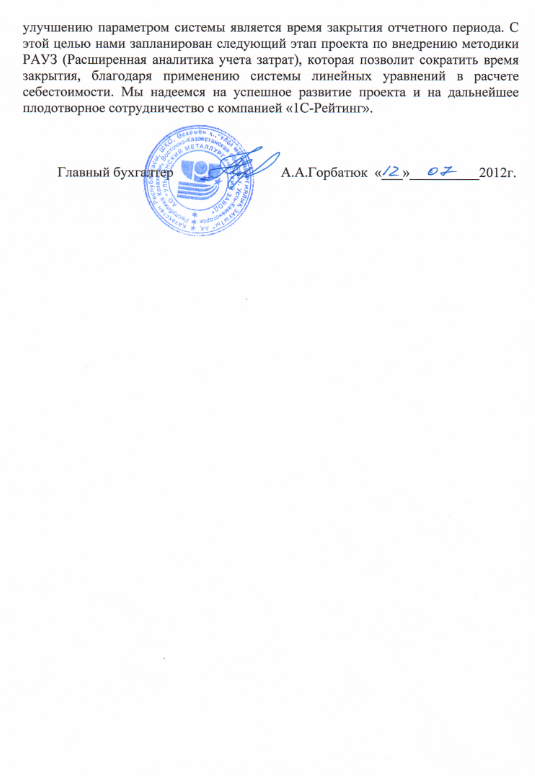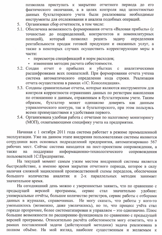 «Очевидно, что по сравнению с предыдущей версией программы, сервис стал значительно удобнее: универсальные отчёты, большое количество регистров, сервис работы с отборами данных в журналах, справочниках. Не могу сказать, что работы у кого-то уменьшилось (возможно, даже увеличилось), но то, что процесс учёта стал гораздо прозрачнее, более систематизирован и управляем — это однозначно. Плюс большие возможности по расширению функционала по сравнению с предыдущей версией программы. Относительно расчёта себестоимости могу отметить, что в рамках поставленной задачи (действующей методики) задача реализована в полном объёме. На мой взгляд, наиболее существенным и желаемым к улучшению параметром системы является время закрытия отчетного периода. С этой целью нами запланирован следующий этап проекта по внедрению методики РАУЗ (Расширенная аналитика учета затрат), которая позволит сократить время закрытия, благодаря применению системы линейных уравнений в расчете себестоимости. Мы надеемся на успешное развитие проекта и на дальнейшее плодотворное сотрудничество с компанией «1С-Рейтинг».