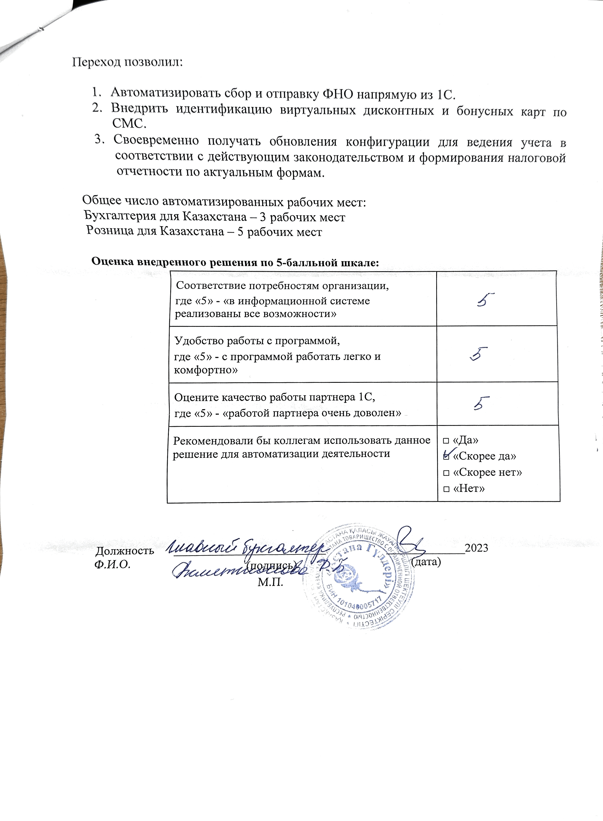 • Установлена учетная система на базе конфигурации «1С:Розница для Казахстана» редакции 2.3 для ведения учета розничных продаж в торговых точках