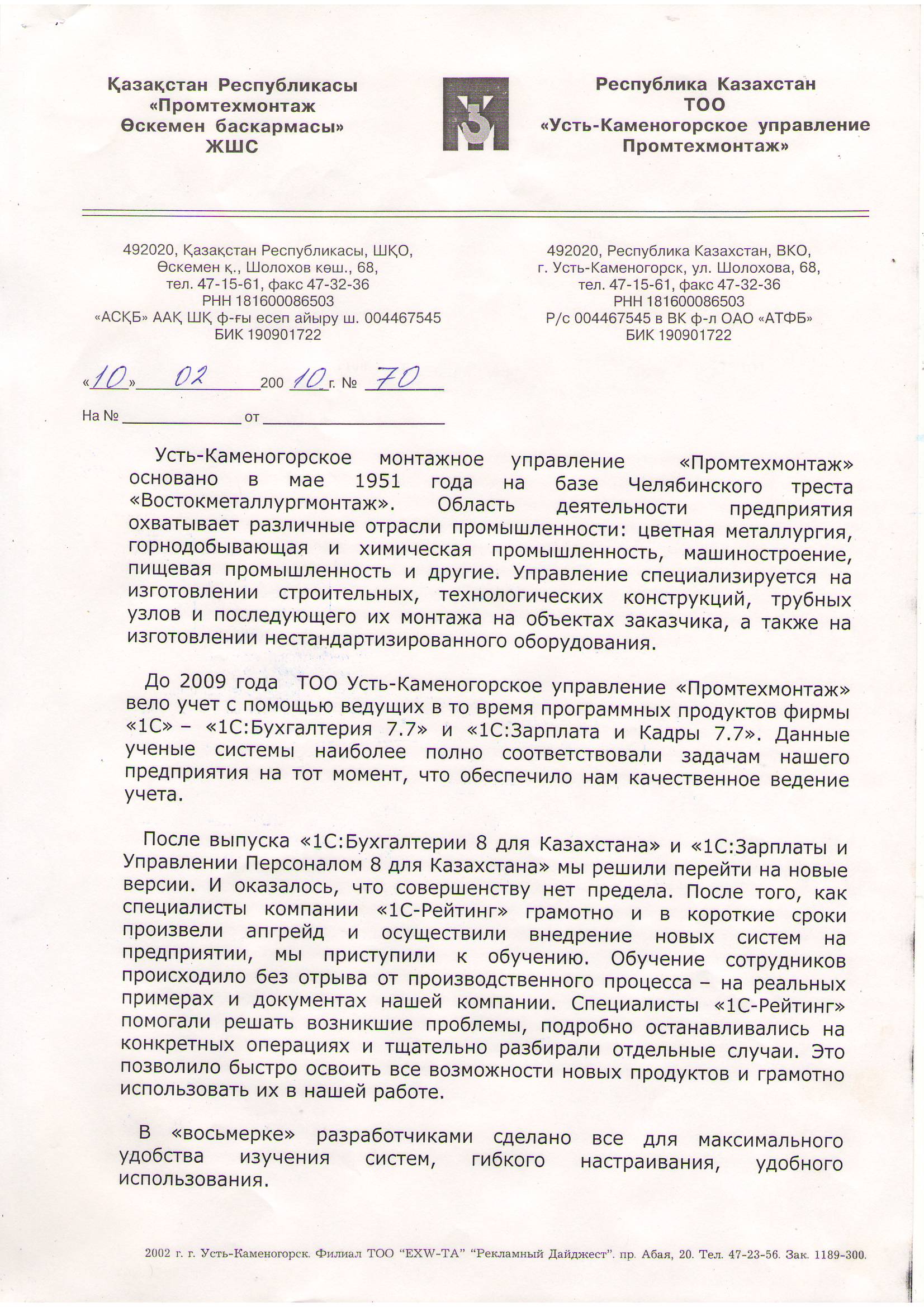 До 2009 года ТОО Усть-Каменогорское управление «Промтехмонтаж» вело учет с помощью ведущих в то время программных продуктов фирмы «1С» – «1С:Бухгалтерия 7.7» и «1С:Зарплата и Кадры 7.7». Данные ученые системы наиболее полно соответствовали задачам предприятия на тот момент, и обеспечило качественное ведение учета.
