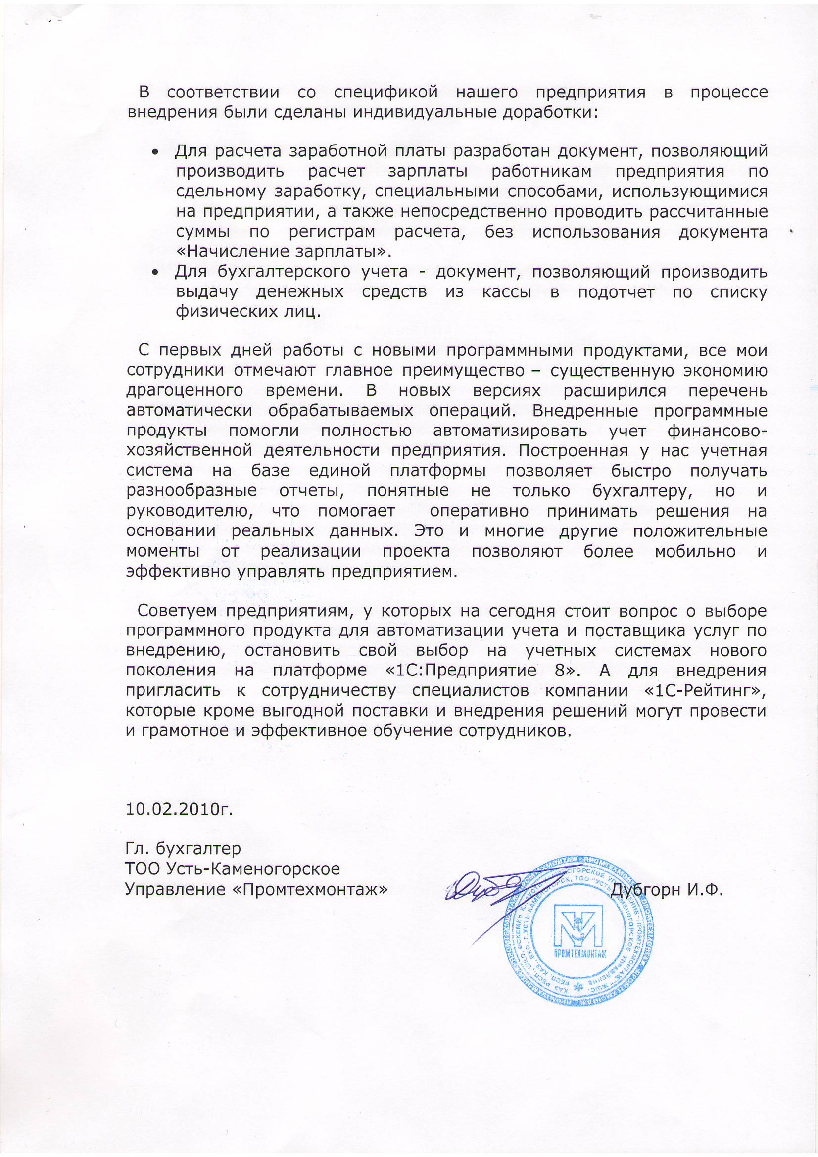 «С первых дней работы с новыми программными продуктами, все мои сотрудники отмечают главное преимущество – существенную экономию драгоценного времени. В новых версиях расширился перечень автоматически обрабатываемых операций. Внедренные программные продукты помогли полностью автоматизировать учет финансово-хозяйственной деятельности предприятия. Построенная у нас учетная система на базе единой платформы позволяет быстро получать разнообразные отчеты, понятные не только бухгалтеру, но и руководителю, что помогает оперативно принимать решения на основании реальных данных. Это и многие другие положительные моменты от реализации проекта позволяют более мобильно и эффективно управлять предприятием. Советуем предприятиям, у которых на сегодня стоит вопрос о выборе программного продукта для автоматизации учета и поставщика услуг по внедрению, остановить свой выбор на учетных системах нового поколения на платформе «1С:Предприятие 8». А для внедрения пригласить к сотрудничеству специалистов компании «1С-Рейтинг», которые кроме выгодной поставки и внедрения решений могут провести и грамотное и эффективное обучение сотрудников».