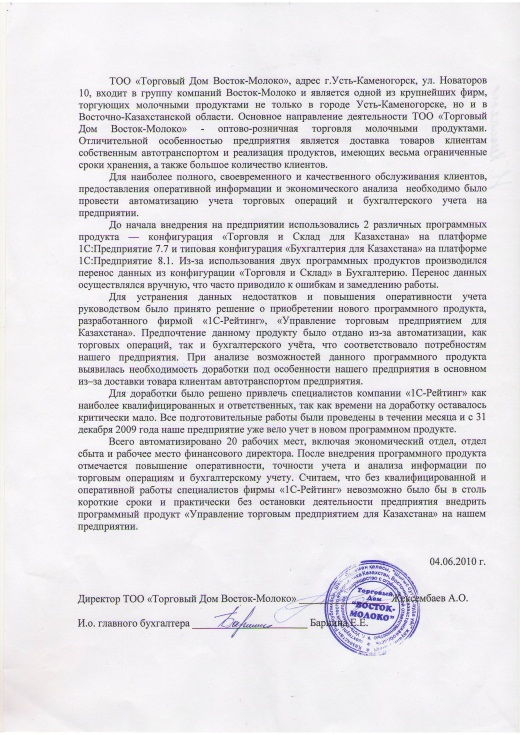 «После внедрения программного продукта отмечается повышение оперативности и точности учета и анализа информации по торговым операциям и бухгалтерскому учету. Считаем, что без квалифицированной и оперативной работы специалистов фирмы «1С-Рейтинг» невозможно было бы в столь короткие сроки и практически без остановки деятельности предприятия внедрить программный продукт «Управление торговым предприятием для Казахстана» на нашем предприятии».