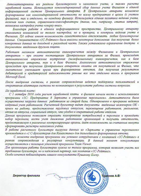 Специалистами компании «1С-Рейтинг» завершен проект по созданию комплексной информационной системы учета Атырауского филиала ТОО «KMG EP-Catering» на базе программных продуктов «1С:Бухгалтерия 8 для Казахстана» и «1С:Зарплата и Управление персоналом 8 для Казахстана».