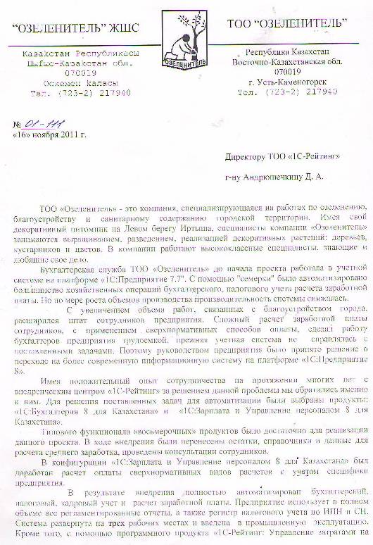 Специалисты компании «1С-Рейтинг» успешно закончили проект комплексной автоматизации ТОО «Озеленитель», предприятия занимающегося озеленением и благоустройством города, с помощью программных продуктов: «1С:Бухгалтерия для Казахстана», «1С:Зарплата и Управление персоналом для Казахстана» и «1С-Рейтинг: Управление затратами на автотранспорт. Путевые листы».