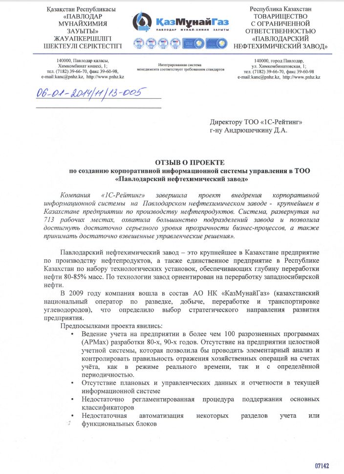 Компания «1С-Рейтинг» завершила проект внедрения корпоративной информационной системы на Павлодарском нефтехимическом заводе — крупнейшем в Казахстане предприятии по производству нефтепродуктов. Система, развернутая на 713 рабочих местах, позволила достичь нового уровня в управлении бизнес-процессами и стала неотъемлемой частью в процессе управления заводом.