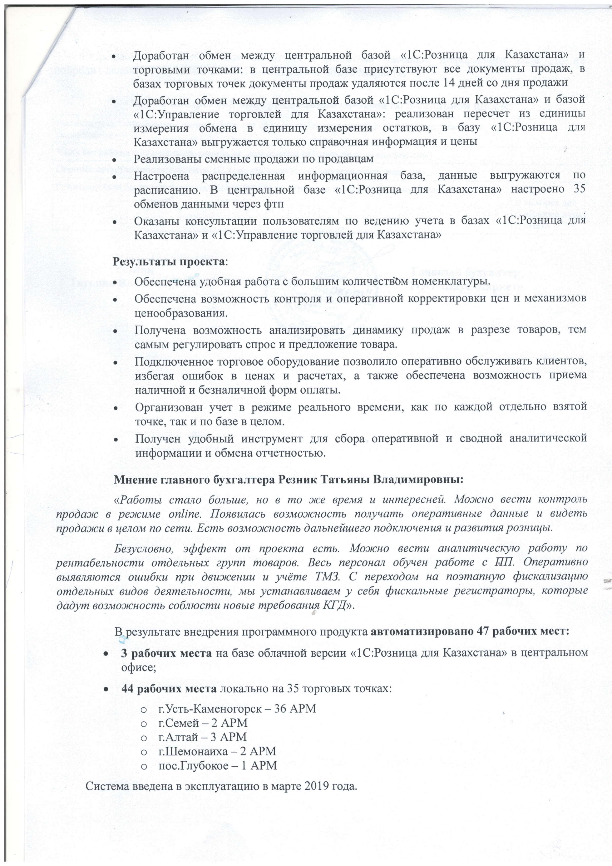 Безусловно, эффект от проекта есть. Можно вести аналитическую работу по рентабельности отдельных групп товаров. Весь персонал обучен работе с ПП. Оперативно выявляются ошибки при движении и учёте ТМЗ. С переходом на поэтапную фискализацию отдельных видов деятельности, мы устанавливаем у себя фискальные регистраторы, которые дадут возможность соблюсти новые требования КГД».