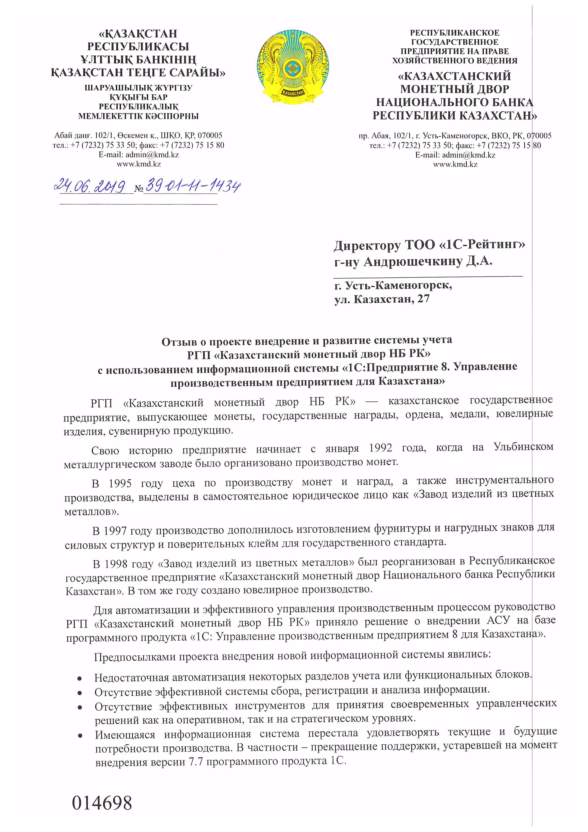РГП «Казахстанский монетный двор НБ РК» автоматизировал управление производственным процессом с помощью «1С:Управление производственным предприятием для Казахстана».