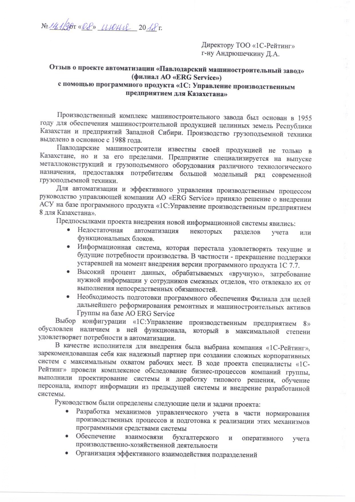 - Необходимость подготовки программного обеспечения Филиала для целей дальнейшего реформирования ремонтных и машиностроительных активов Группы на базе АО ERGService