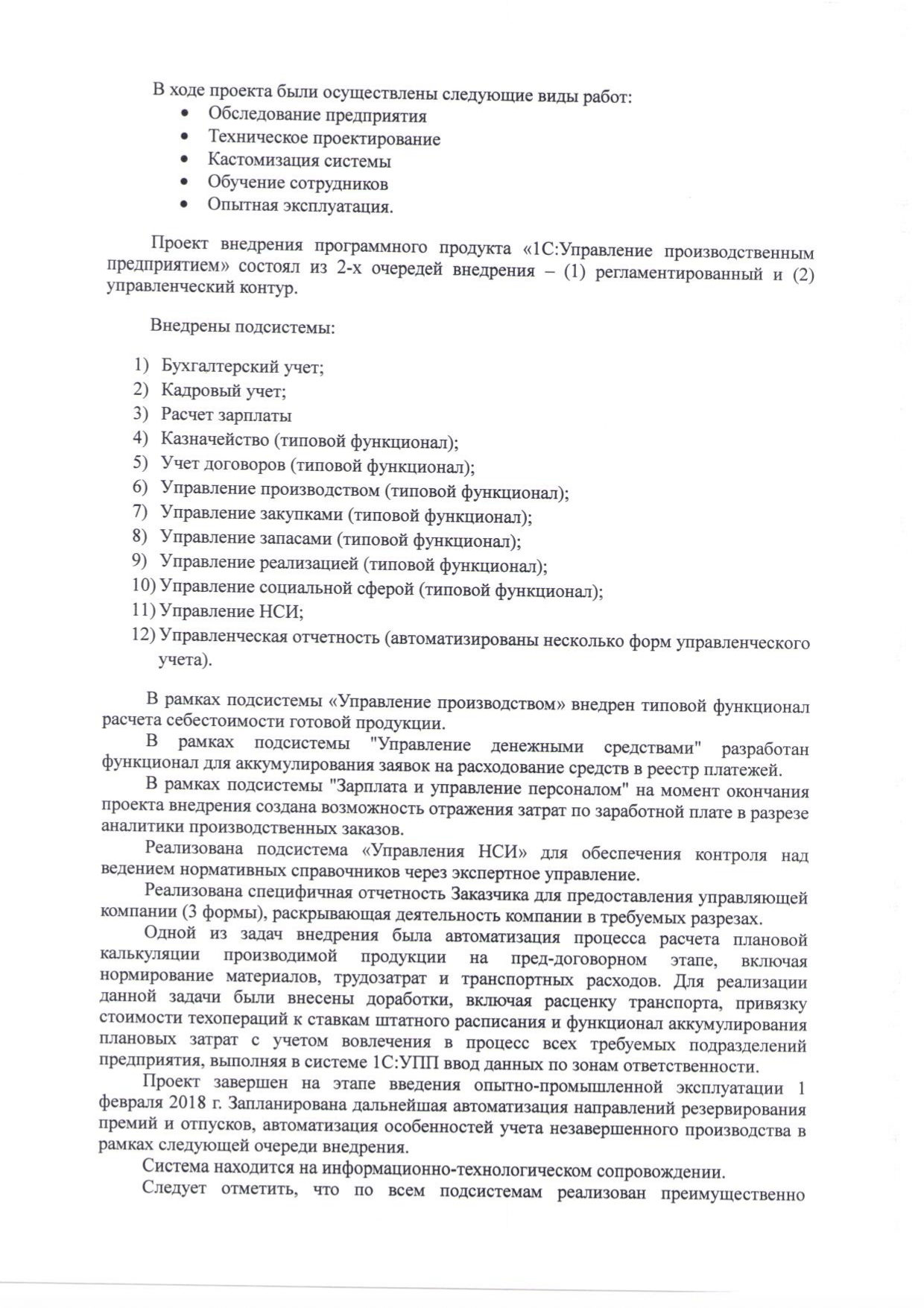 - В рамках подсистемы «Зарплата и управление персоналом» на момент окончания проекта внедрения создана возможность отражения затрат по заработной плате в разрезе аналитики производственных заказов.
