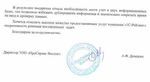 «В результате внедрения отпала необходимость вести учет в двух информационных базах, что позволило избежать дублирования информации и значительно сократить время на ввод и проверку данных. Хочется отметить высокое качество предоставляемых услуг компании «1С-Рейтинг» оперативность решения поставленных задач. Благодарим за сотрудничество».