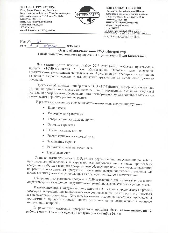 | Внедренное типовое решение: | 1С:Бухгалтерия 8 для Казахстана |