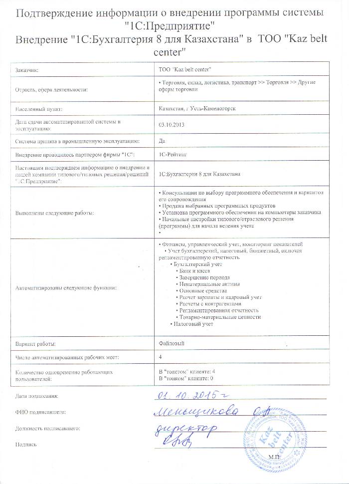 | Внедренное типовое решение: | 1С:Бухгалтерия 8 для Казахстана |