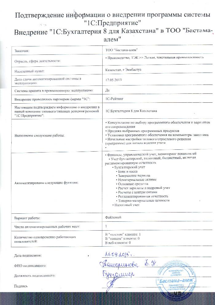 | Внедренное типовое решение: | 1С:Бухгалтерия для Казахстана |