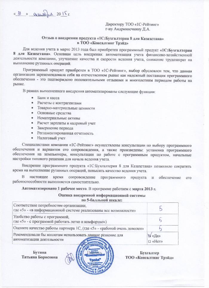 | Внедренное типовое решение: | 1С:Бухгалтерия 8 для Казахстана |