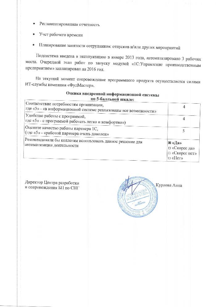В настоящее время силами ИТ службы компании «ФудМастер» успешно выполнено внедрение подсистемы «Зарплата и управление персоналом».