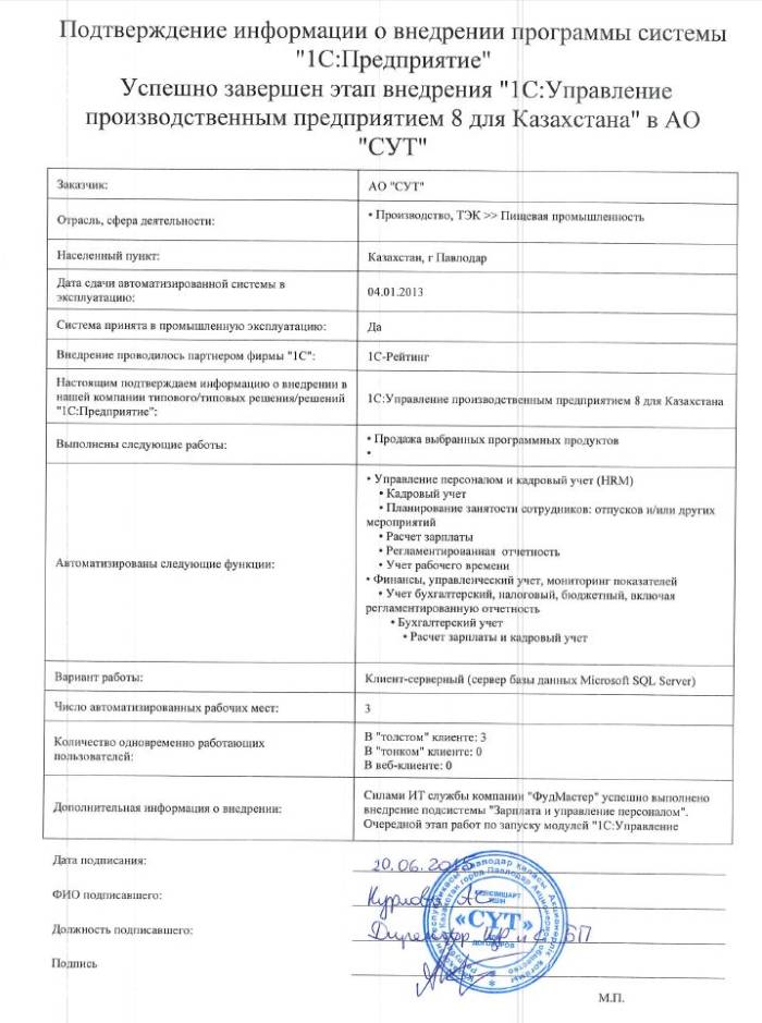 Программный продукт «1С:Управление производственным предприятием 8 для Казахстана» приобретен у давнего партнера компании «ФудМастер» — ТОО «1С-Рейтинг», сотрудничество с данной фирмой насчитывает более 10 лет, в рамках данного сотрудничества автоматизировано не одно предприятие входящее в состав холдинга.