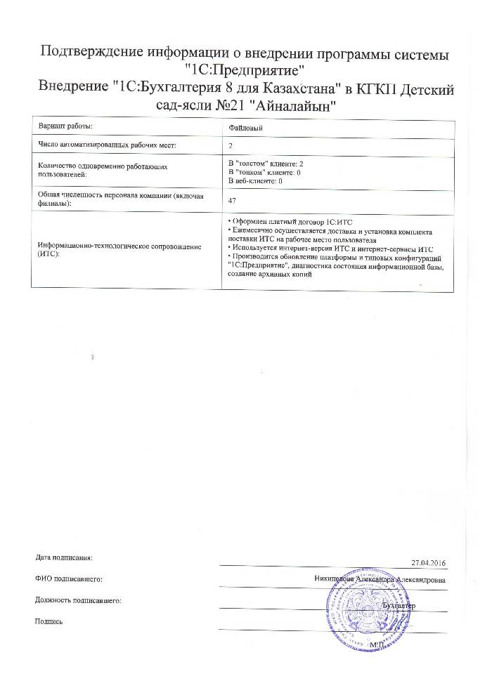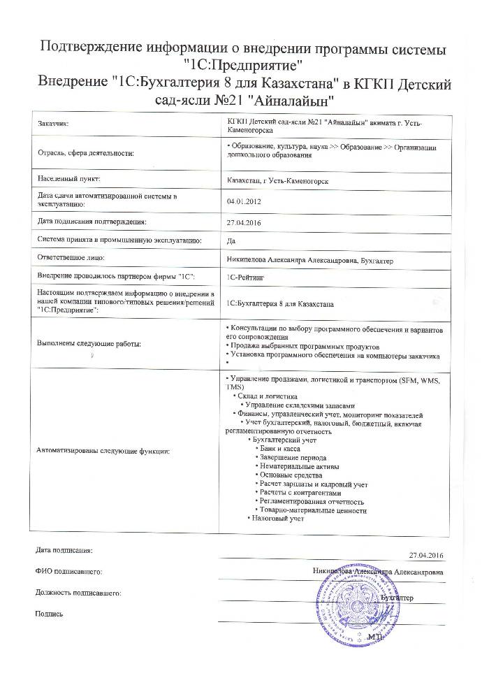 | Внедренное типовое решение: | 1С:Бухгалтерия 8 для Казахстана |