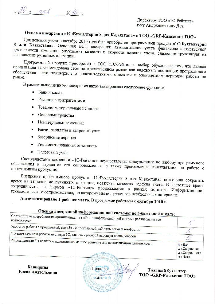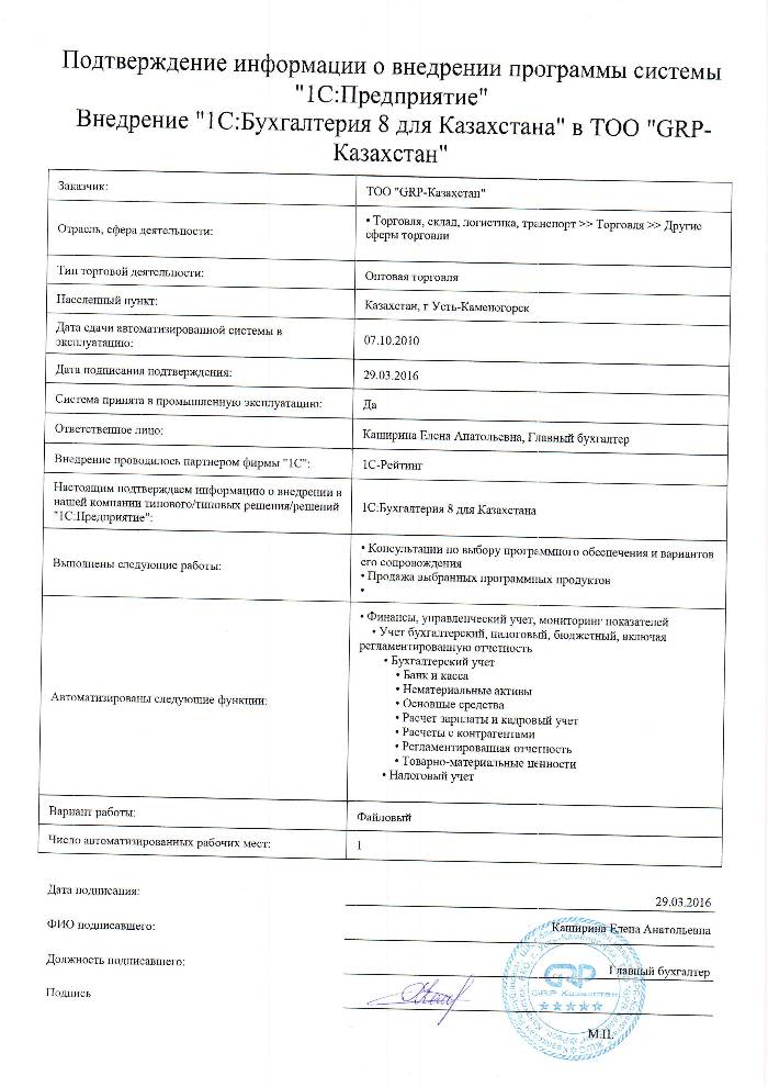 Внедрение 1C:Бухгалтерия 8 для Казахстана в ТОО GRP-Казахстан